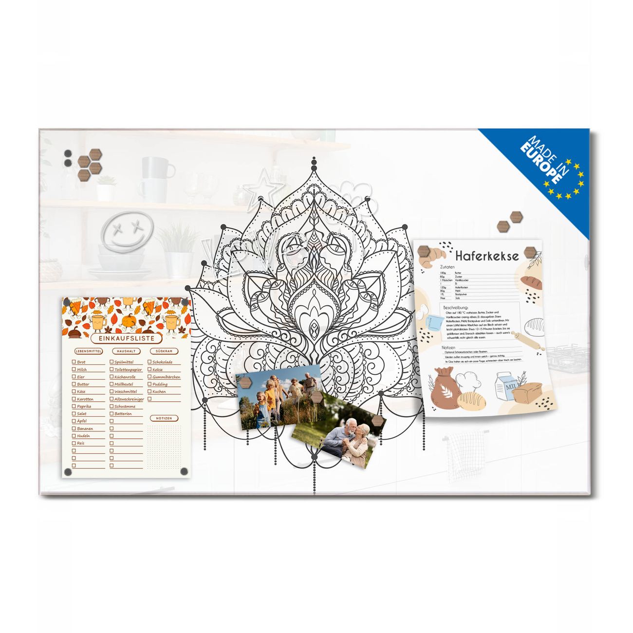 Ein Stück Design, das Ihren Alltag organisiert. Schreiben, heften, inspirieren - alles an einem Ort. Qualität, die man spürt. Montage leicht gemacht. Handwerk mit Herz - veredelt in Sachsen. Einzigartiges Design mit Motiv Motiv Mandala Muster Beschreibbare Glasoberfläche, leicht zu reinigen Starke Magnetkraft durch Stahlrückwand Inklusive 4 Neodym-Magneten Flexible Montageoptionen Handveredelt in Sachsen - Qualität, die bleibt