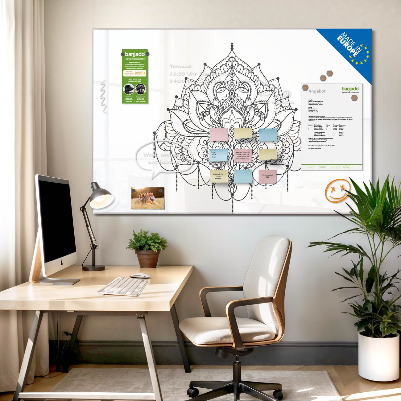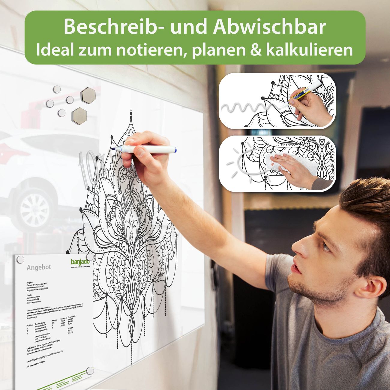 Jede Glas Magnettafel wird in unserer Werkstatt von Hand gefertigt und sorgfältig geprüft. So erhalten Sie ein echtes Qualitätsprodukt, das Funktion und Ästhetik perfekt vereint.?? Warum banjado?