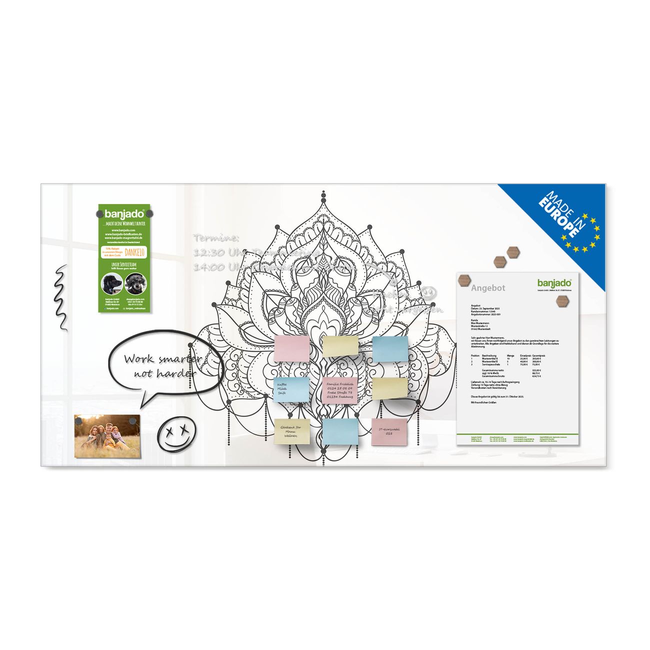 Ein Stück Design, das Ihren Alltag organisiert. Schreiben, heften, inspirieren - alles an einem Ort. Qualität, die man spürt. Montage leicht gemacht. Handwerk mit Herz - veredelt in Sachsen. Einzigartiges Design mit Motiv Motiv Mandala Muster Beschreibbare Glasoberfläche, leicht zu reinigen Starke Magnetkraft durch Stahlrückwand Inklusive 4 Neodym-Magneten Flexible Montageoptionen Handveredelt in Sachsen - Qualität, die bleibt
