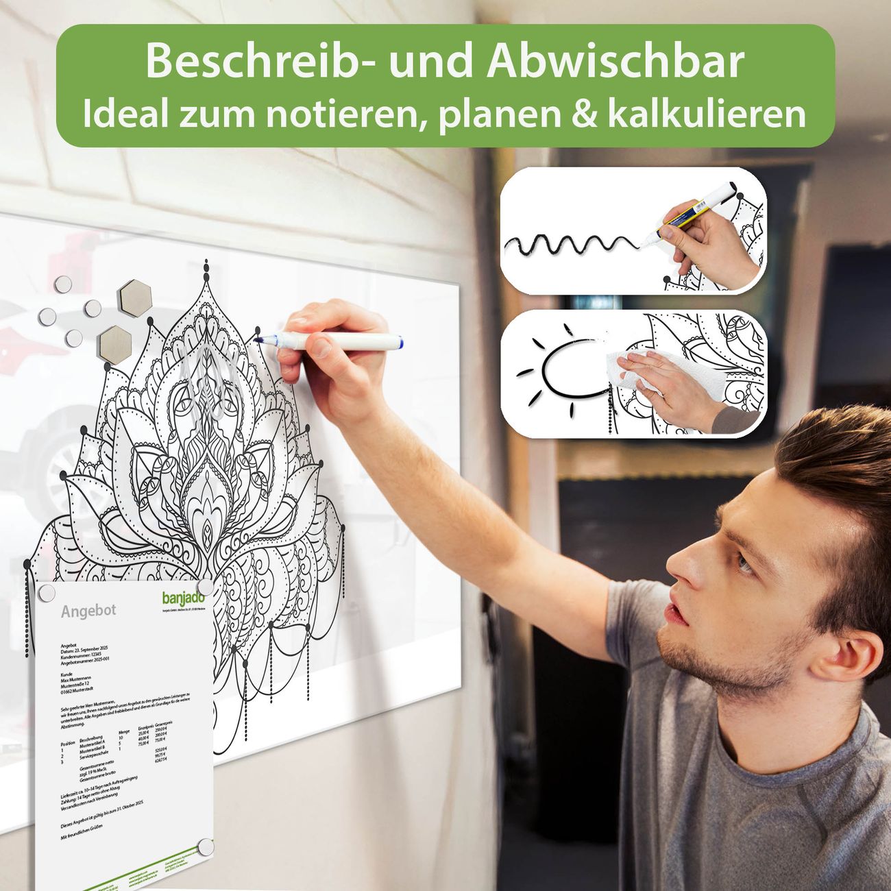 Jede Glas Magnettafel wird in unserer Werkstatt von Hand gefertigt und sorgfältig geprüft. So erhalten Sie ein echtes Qualitätsprodukt, das Funktion und Ästhetik perfekt vereint.?? Warum banjado?