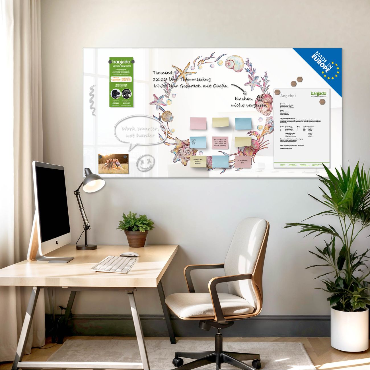 Jede Glas Magnettafel wird in unserer Werkstatt von Hand gefertigt und sorgfältig geprüft. So erhalten Sie ein echtes Qualitätsprodukt, das Funktion und Ästhetik perfekt vereint.?? Warum banjado?