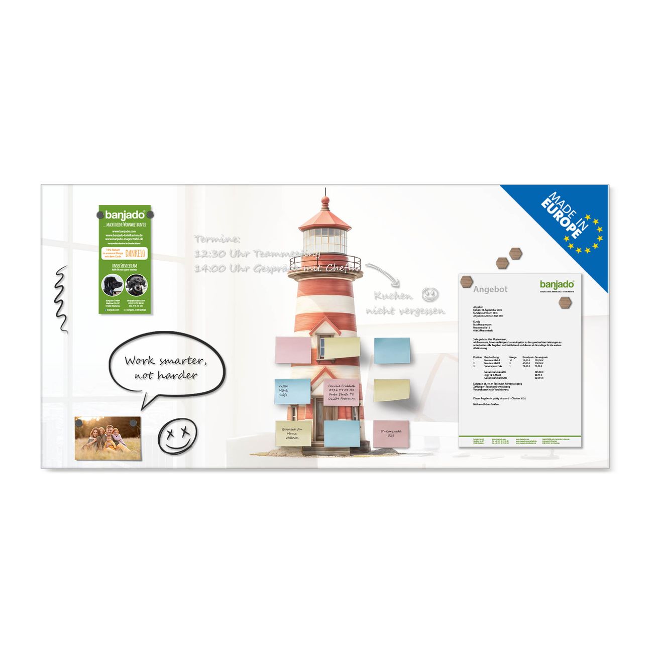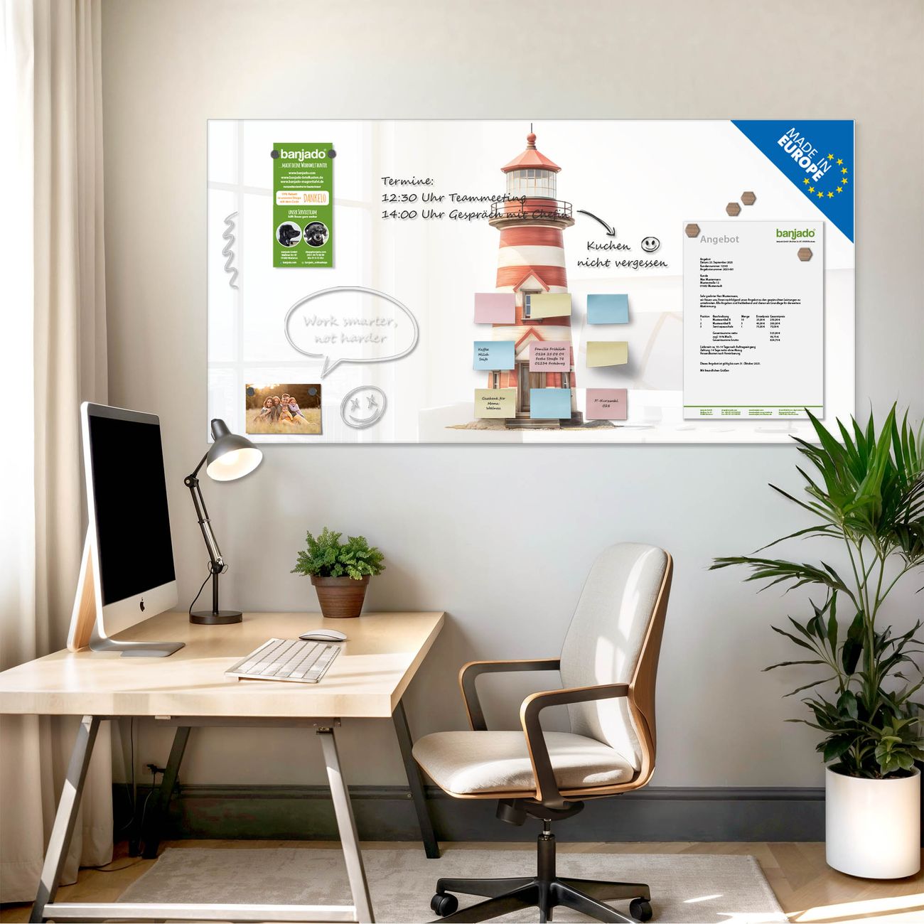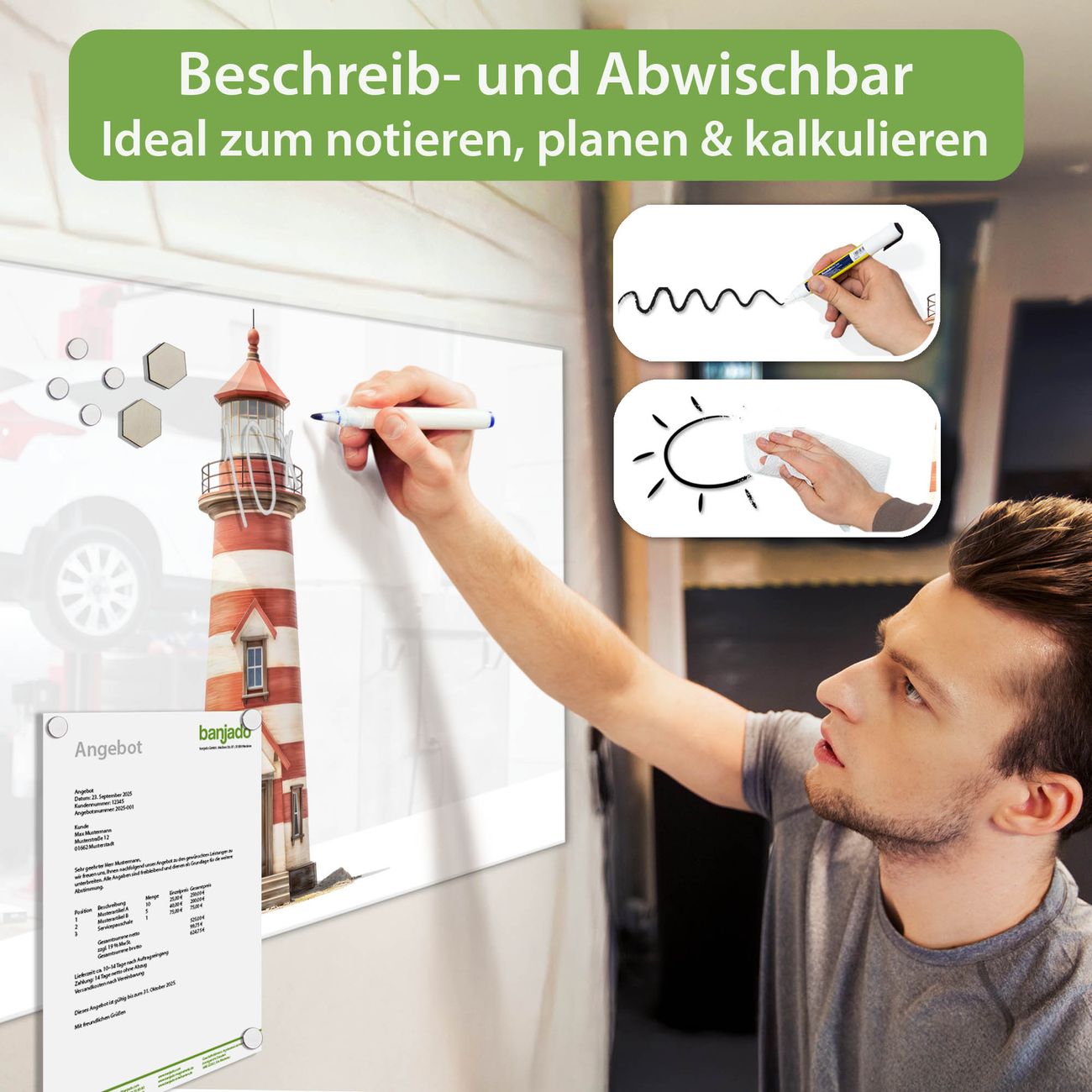 Jede Glas Magnettafel wird in unserer Werkstatt von Hand gefertigt und sorgfältig geprüft. So erhalten Sie ein echtes Qualitätsprodukt, das Funktion und Ästhetik perfekt vereint.?? Warum banjado?