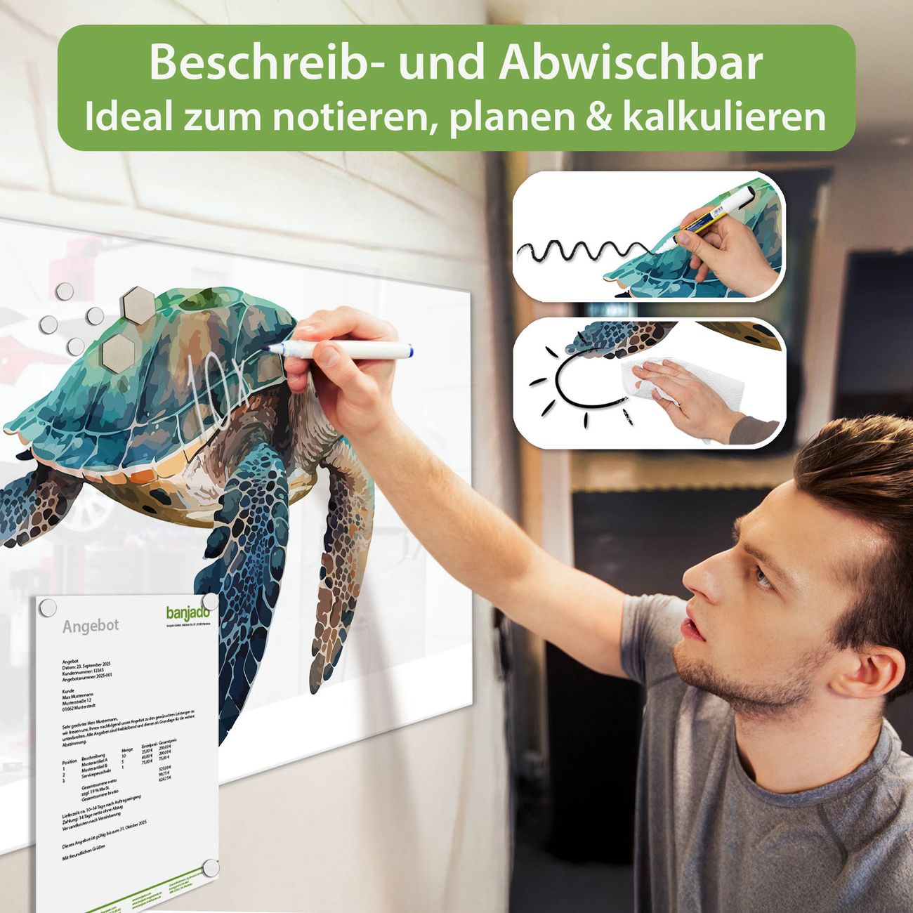 Die banjado Glas Magnettafel mit dem Motiv Motiv Meeresschildkröte Abenteuer verbindet Funktionalität mit Stil. Sie ersetzt das Zettelchaos durch klare Strukturen und bringt dabei eine warme, natürliche Atmosphäre in Ihr Zuhause. Ob im Büro, in der Küche oder im Eingangsbereich - dieses Design-Board zieht Blicke an und sorgt für Ordnung mit Charakter.