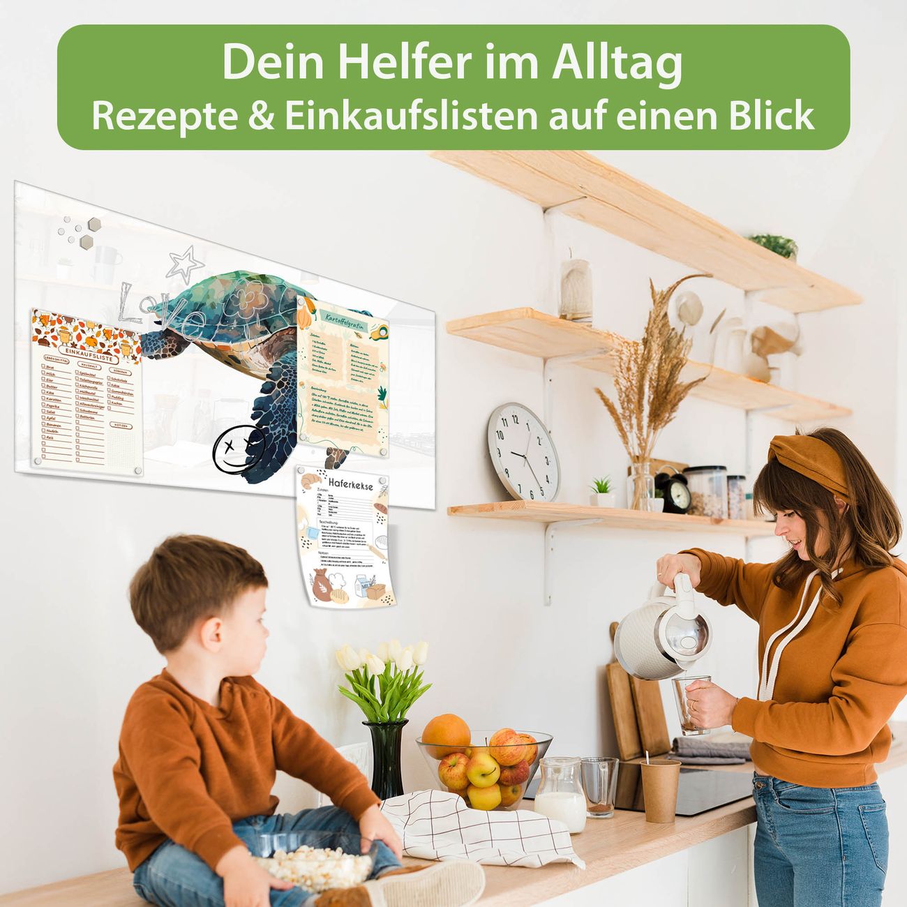 Ein Stück Design, das Ihren Alltag organisiert. Schreiben, heften, inspirieren - alles an einem Ort. Qualität, die man spürt. Montage leicht gemacht. Handwerk mit Herz - veredelt in Sachsen. Einzigartiges Design mit Motiv Motiv Meeresschildkröte Abenteuer Beschreibbare Glasoberfläche, leicht zu reinigen Starke Magnetkraft durch Stahlrückwand Inklusive 4 Neodym-Magneten Flexible Montageoptionen Handveredelt in Sachsen - Qualität, die bleibt