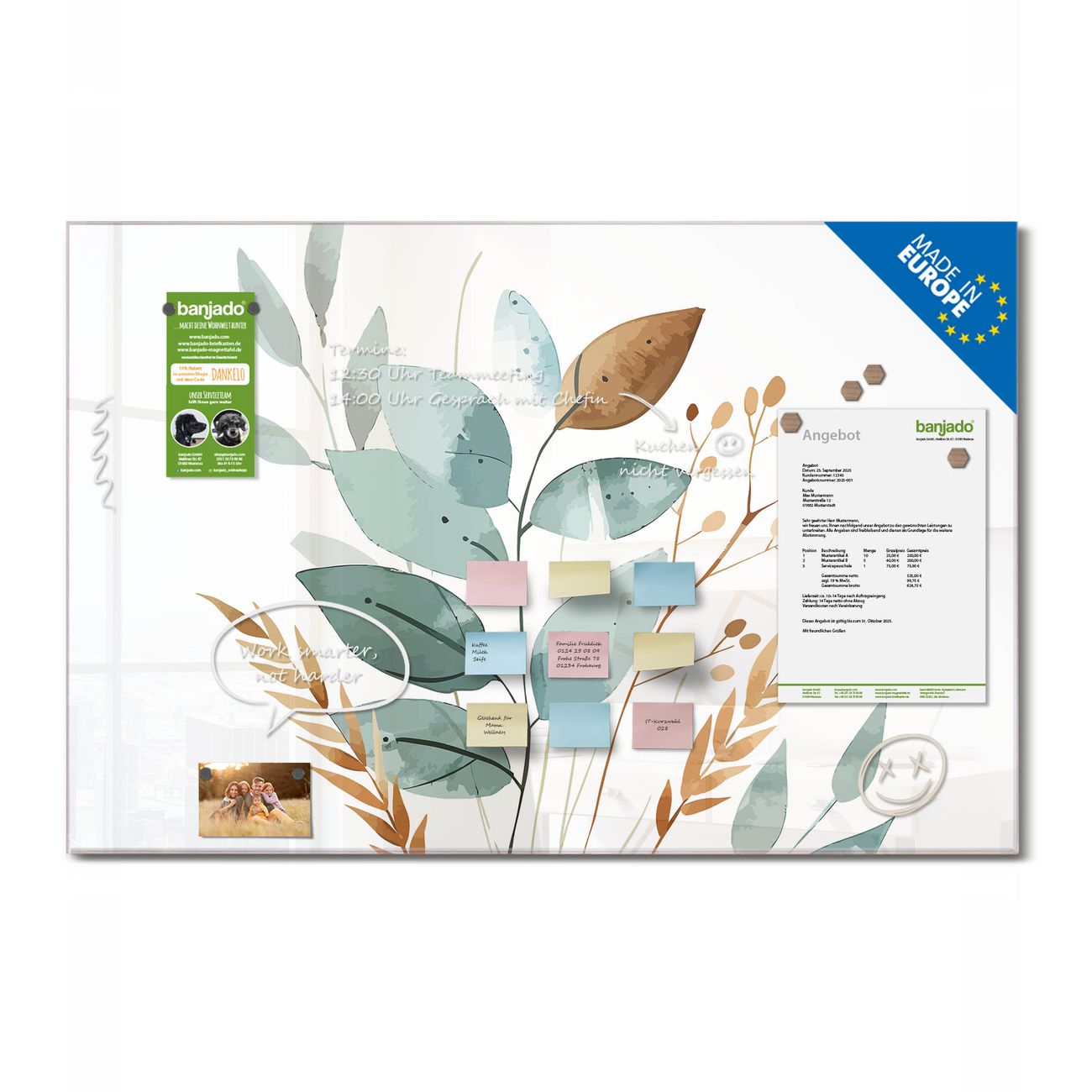 Jede Glas Magnettafel wird in unserer Werkstatt von Hand gefertigt und sorgfältig geprüft. So erhalten Sie ein echtes Qualitätsprodukt, das Funktion und Ästhetik perfekt vereint.?? Warum banjado?
