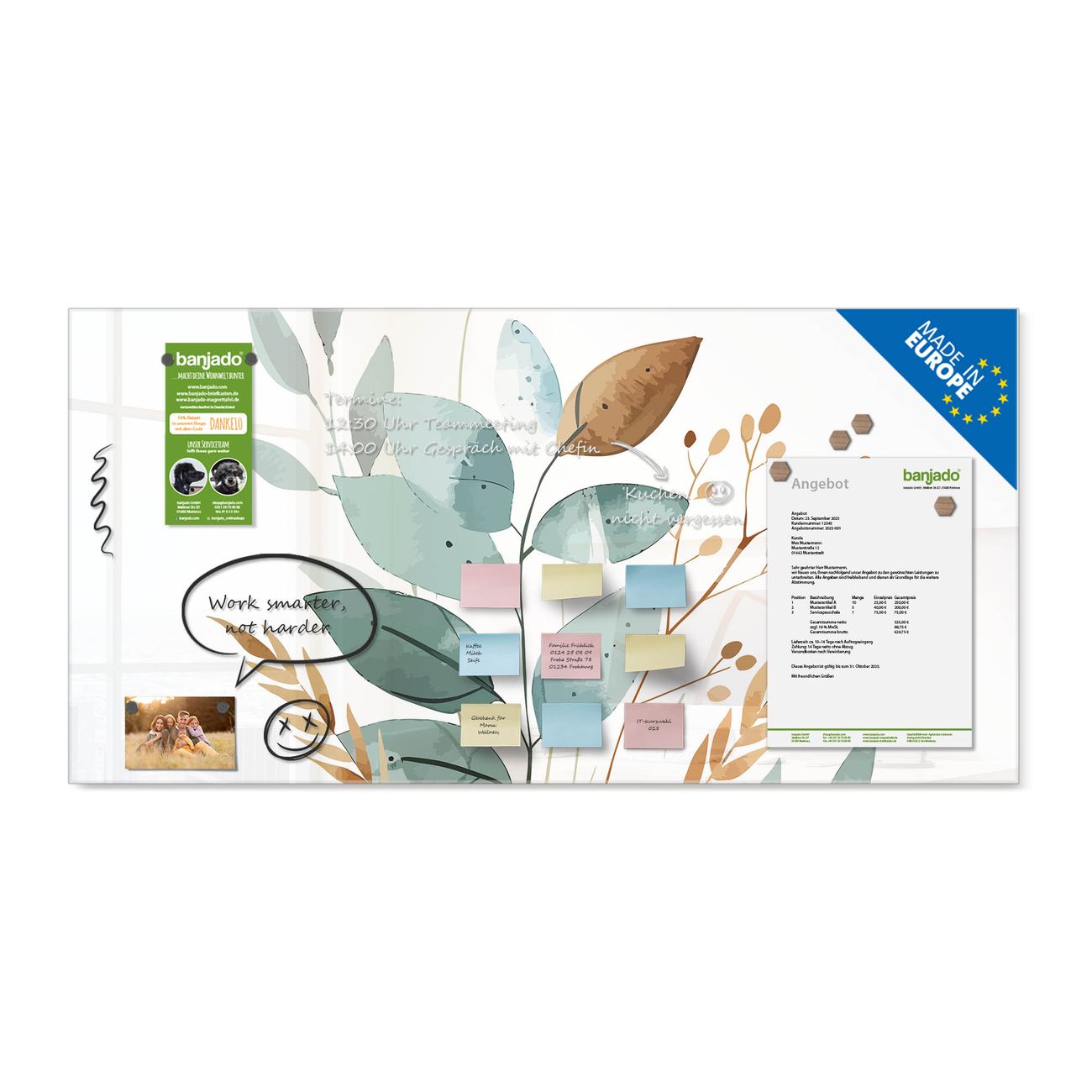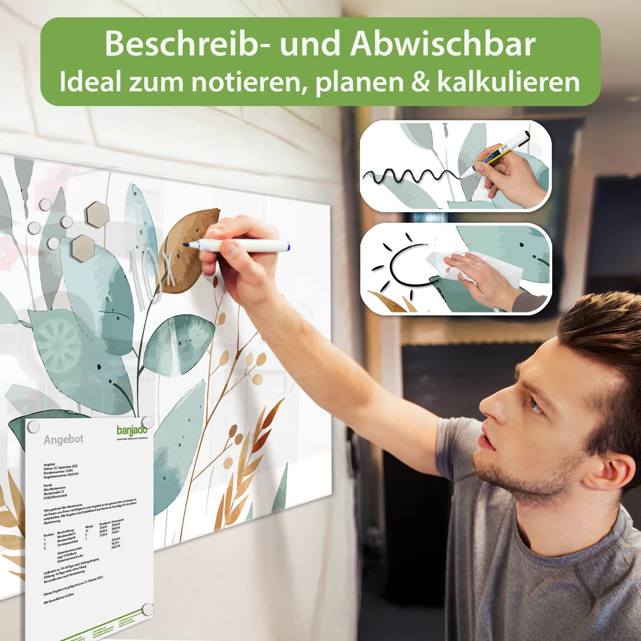 Jede Glas Magnettafel wird in unserer Werkstatt von Hand gefertigt und sorgfältig geprüft. So erhalten Sie ein echtes Qualitätsprodukt, das Funktion und Ästhetik perfekt vereint.?? Warum banjado?