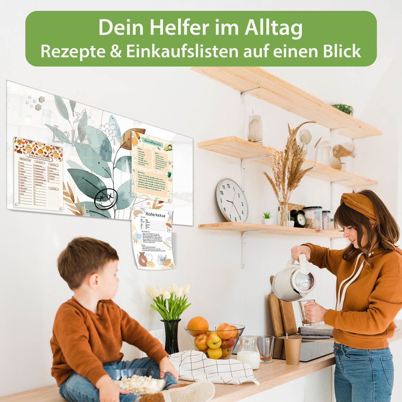 Auf der glatten Glasoberfläche lassen sich Termine, Rezepte oder Notizen ganz einfach mit Kreidestiften festhalten und rückstandslos entfernen. Starke Neodym-Magnete halten Ihre wichtigsten Erinnerungen sicher an Ort und Stelle. So entsteht Ihre ganz persönliche Ideenwand - jeden Tag neu.