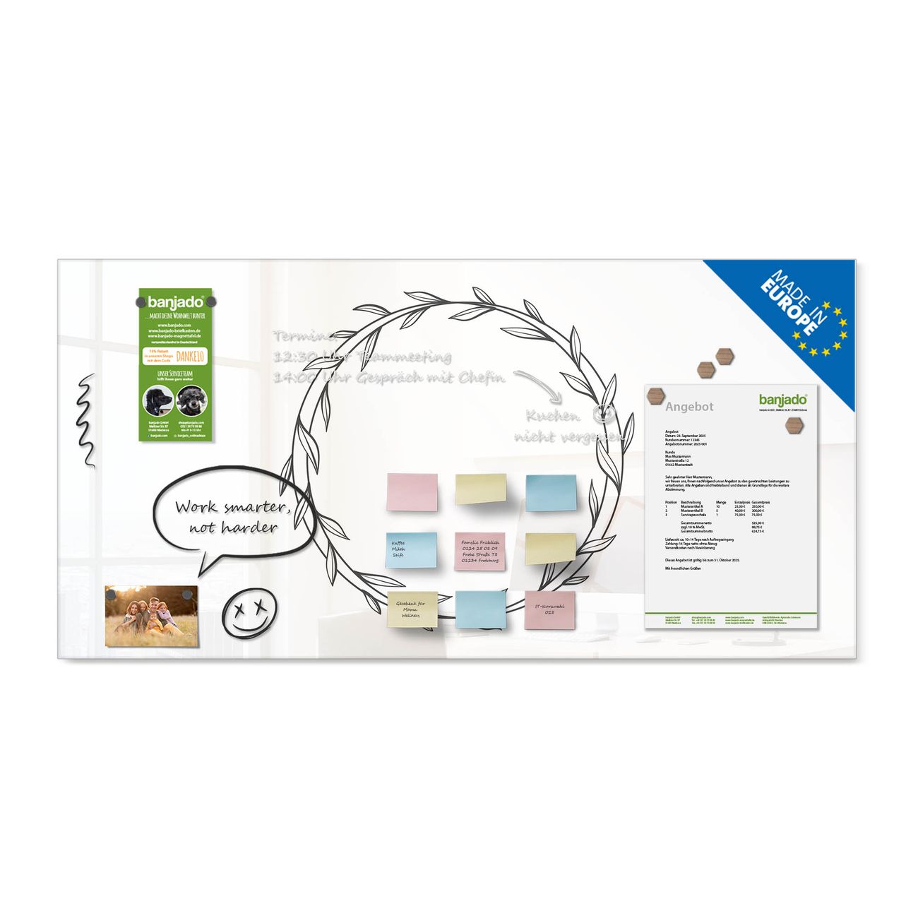 Jede Glas Magnettafel wird in unserer Werkstatt von Hand gefertigt und sorgfältig geprüft. So erhalten Sie ein echtes Qualitätsprodukt, das Funktion und Ästhetik perfekt vereint.?? Warum banjado?