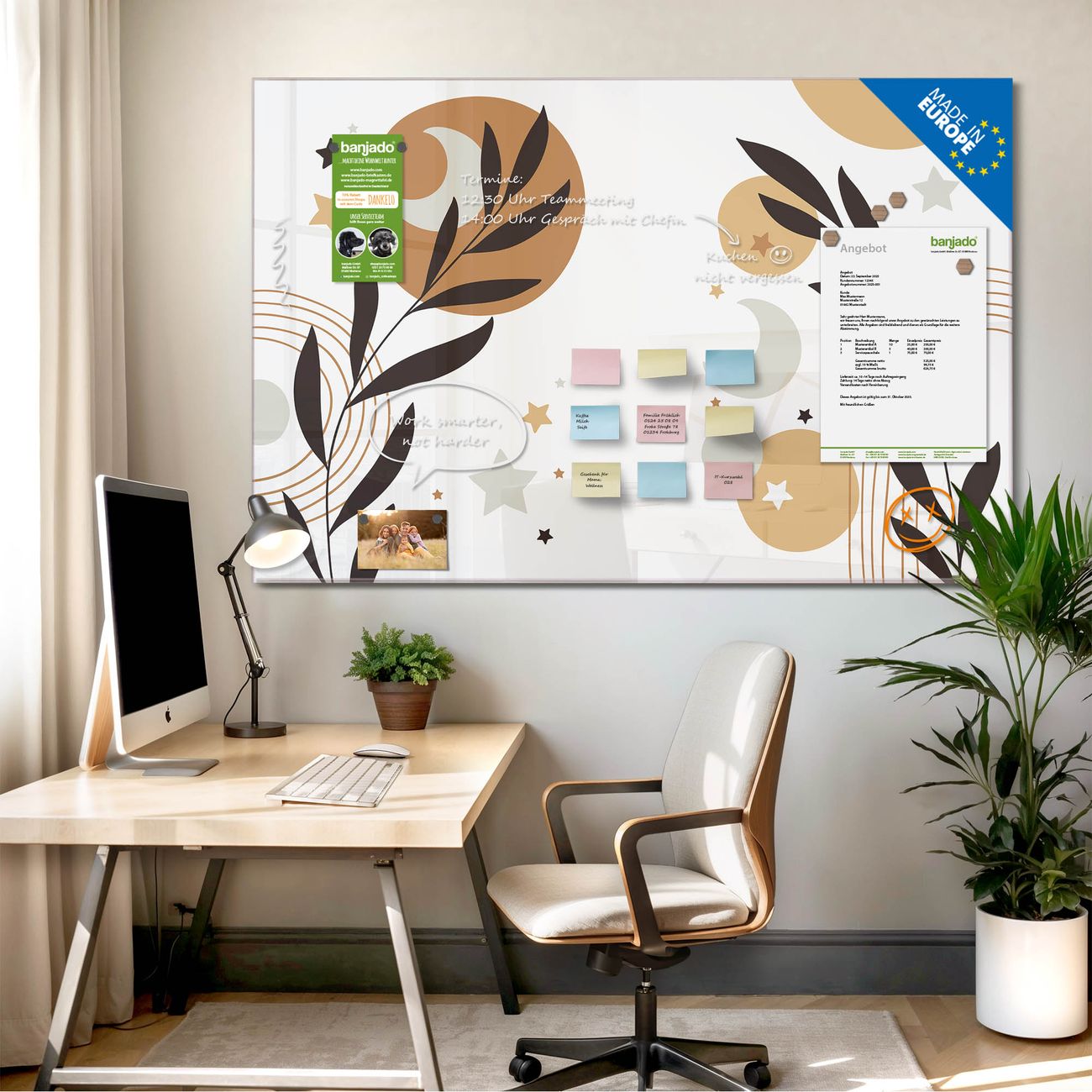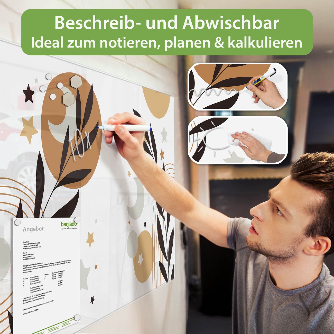 Jede Glas Magnettafel wird in unserer Werkstatt von Hand gefertigt und sorgfältig geprüft. So erhalten Sie ein echtes Qualitätsprodukt, das Funktion und Ästhetik perfekt vereint.?? Warum banjado?