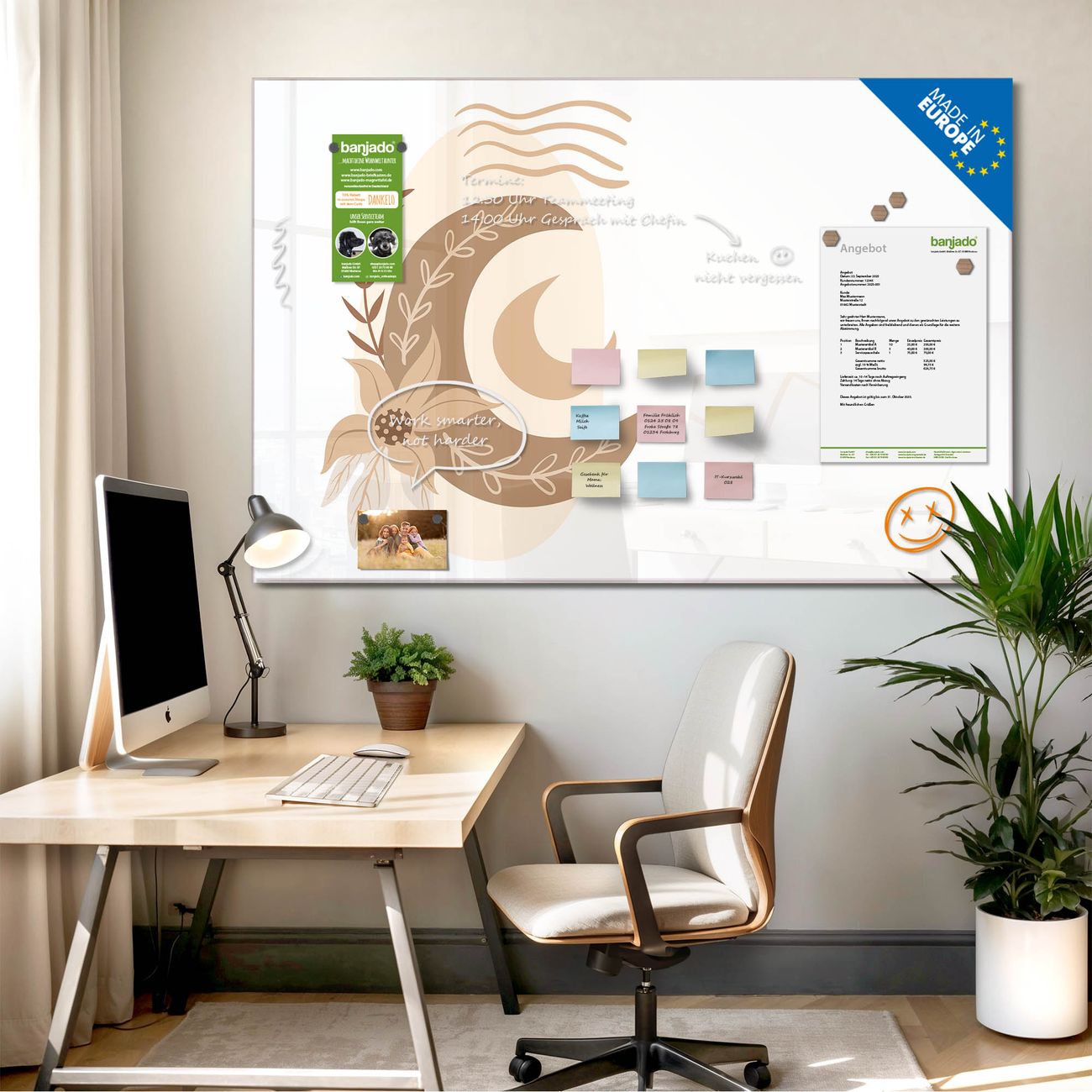 Jede Glas Magnettafel wird in unserer Werkstatt von Hand gefertigt und sorgfältig geprüft. So erhalten Sie ein echtes Qualitätsprodukt, das Funktion und Ästhetik perfekt vereint.?? Warum banjado?