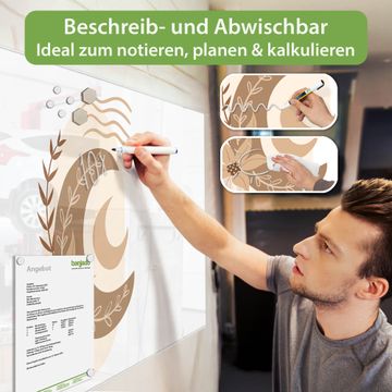 Auf der glatten Glasoberfläche lassen sich Termine, Rezepte oder Notizen ganz einfach mit Kreidestiften festhalten und rückstandslos entfernen. Starke Neodym-Magnete halten Ihre wichtigsten Erinnerungen sicher an Ort und Stelle. So entsteht Ihre ganz persönliche Ideenwand - jeden Tag neu.