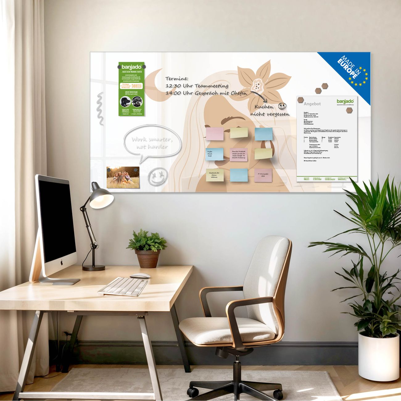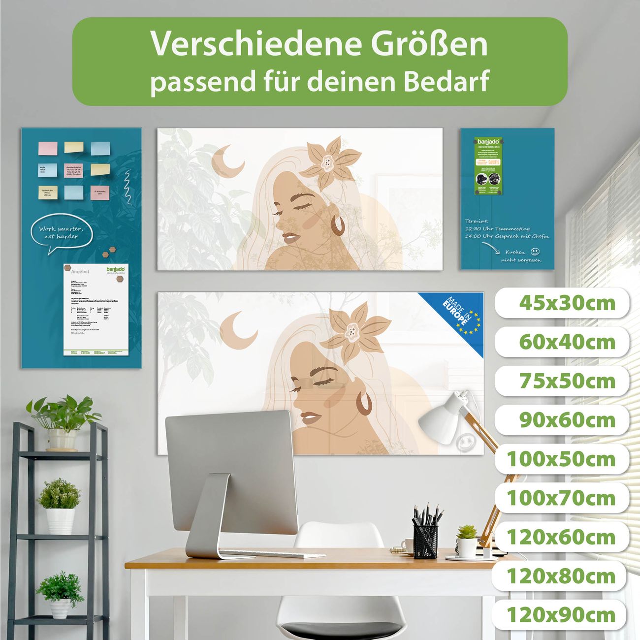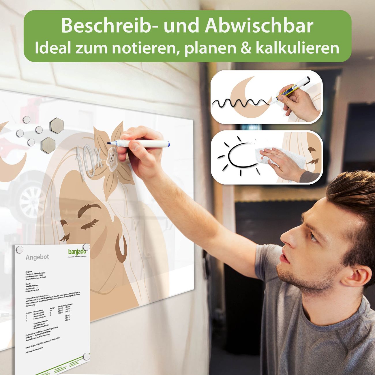 Die banjado Glas Magnettafel mit dem Motiv Motiv Mondblumenfrau verbindet Funktionalität mit Stil. Sie ersetzt das Zettelchaos durch klare Strukturen und bringt dabei eine warme, natürliche Atmosphäre in Ihr Zuhause. Ob im Büro, in der Küche oder im Eingangsbereich - dieses Design-Board zieht Blicke an und sorgt für Ordnung mit Charakter.