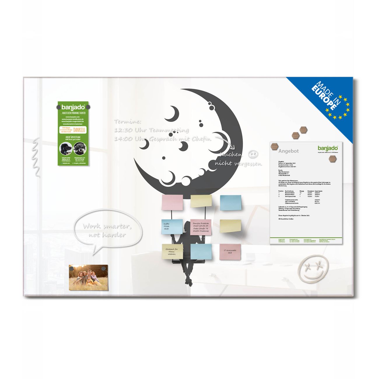 Ein Stück Design, das Ihren Alltag organisiert. Schreiben, heften, inspirieren - alles an einem Ort. Qualität, die man spürt. Montage leicht gemacht. Handwerk mit Herz - veredelt in Sachsen. Einzigartiges Design mit Motiv Motiv Mondschaukel Beschreibbare Glasoberfläche, leicht zu reinigen Starke Magnetkraft durch Stahlrückwand Inklusive 4 Neodym-Magneten Flexible Montageoptionen Handveredelt in Sachsen - Qualität, die bleibt