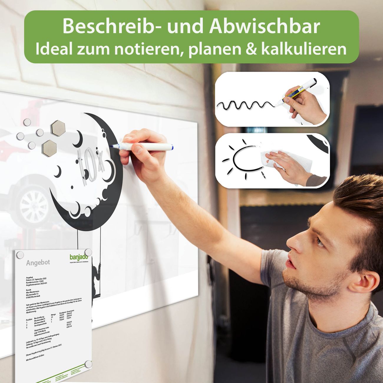 Jede Glas Magnettafel wird in unserer Werkstatt von Hand gefertigt und sorgfältig geprüft. So erhalten Sie ein echtes Qualitätsprodukt, das Funktion und Ästhetik perfekt vereint.?? Warum banjado?