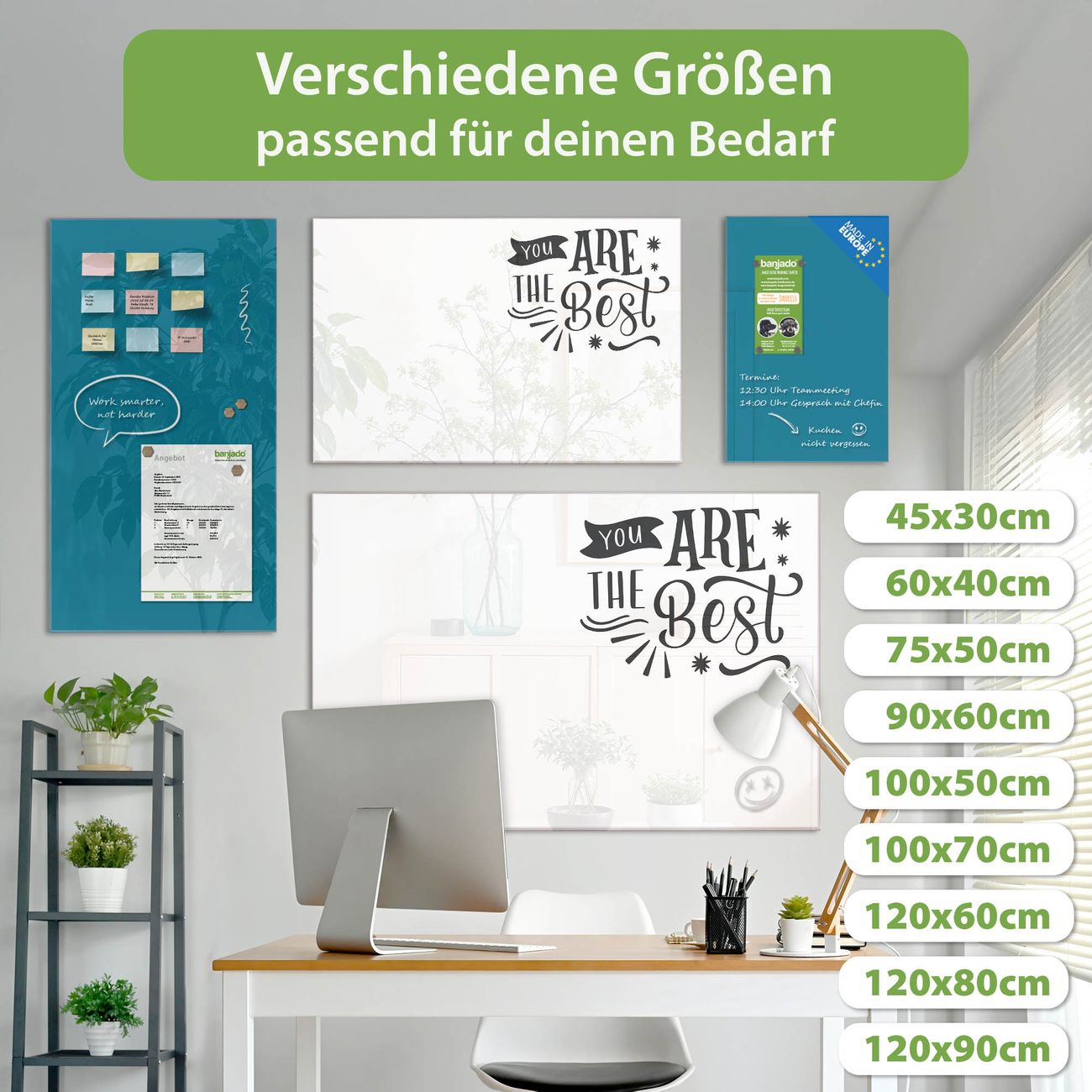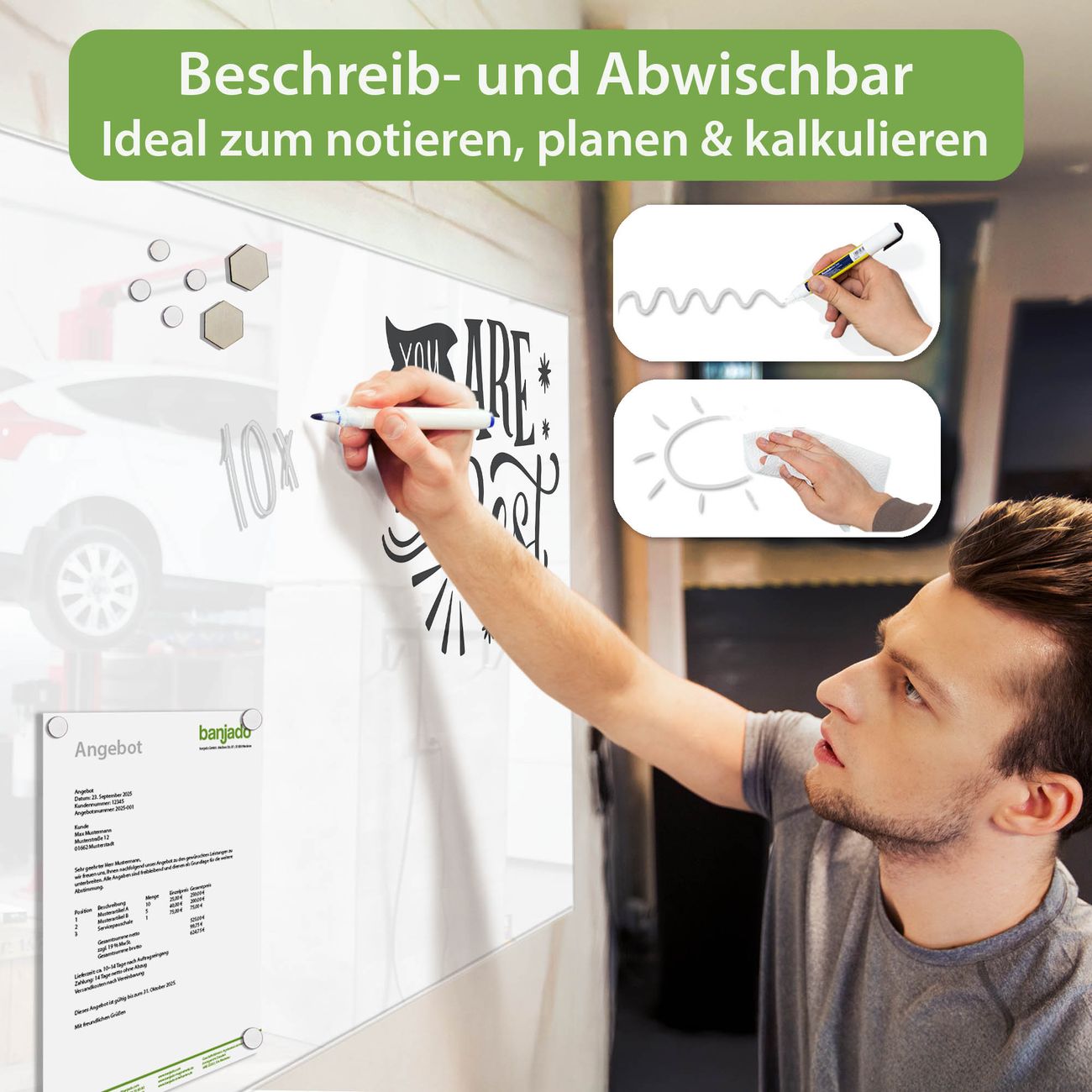 Jede Glas Magnettafel wird in unserer Werkstatt von Hand gefertigt und sorgfältig geprüft. So erhalten Sie ein echtes Qualitätsprodukt, das Funktion und Ästhetik perfekt vereint.?? Warum banjado?