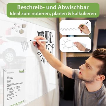 Auf der glatten Glasoberfläche lassen sich Termine, Rezepte oder Notizen ganz einfach mit Kreidestiften festhalten und rückstandslos entfernen. Starke Neodym-Magnete halten Ihre wichtigsten Erinnerungen sicher an Ort und Stelle. So entsteht Ihre ganz persönliche Ideenwand - jeden Tag neu.