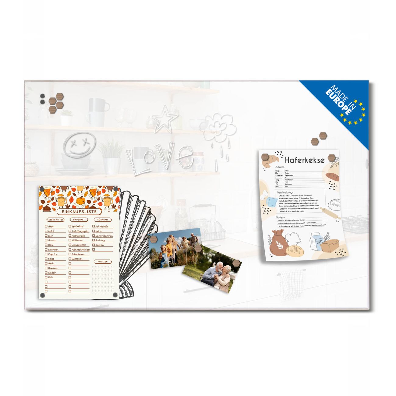 Auf der glatten Glasoberfläche lassen sich Termine, Rezepte oder Notizen ganz einfach mit Kreidestiften festhalten und rückstandslos entfernen. Starke Neodym-Magnete halten Ihre wichtigsten Erinnerungen sicher an Ort und Stelle. So entsteht Ihre ganz persönliche Ideenwand - jeden Tag neu.