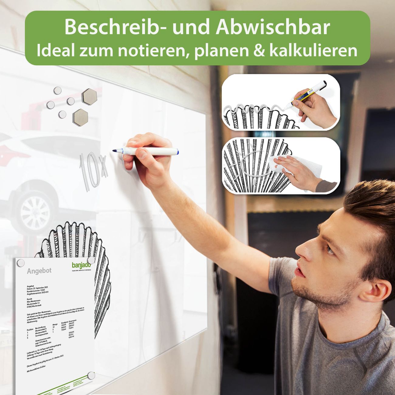 Bitte beachten Sie, dass ausschliessliche spezielle Magnete an der Glastafel haften. Wir empfehlen banjado Neodym Magnete, diese sind durch uns auf Wirksamkeit geprüft.
