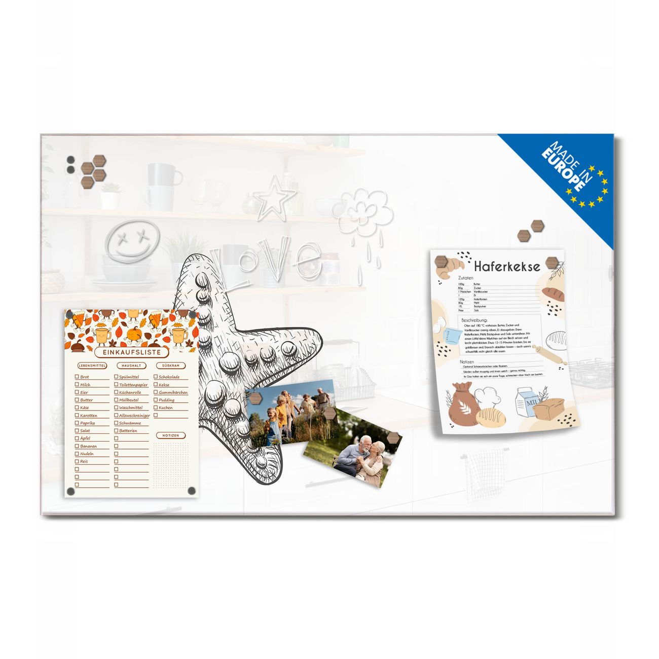 Auf der glatten Glasoberfläche lassen sich Termine, Rezepte oder Notizen ganz einfach mit Kreidestiften festhalten und rückstandslos entfernen. Starke Neodym-Magnete halten Ihre wichtigsten Erinnerungen sicher an Ort und Stelle. So entsteht Ihre ganz persönliche Ideenwand - jeden Tag neu.