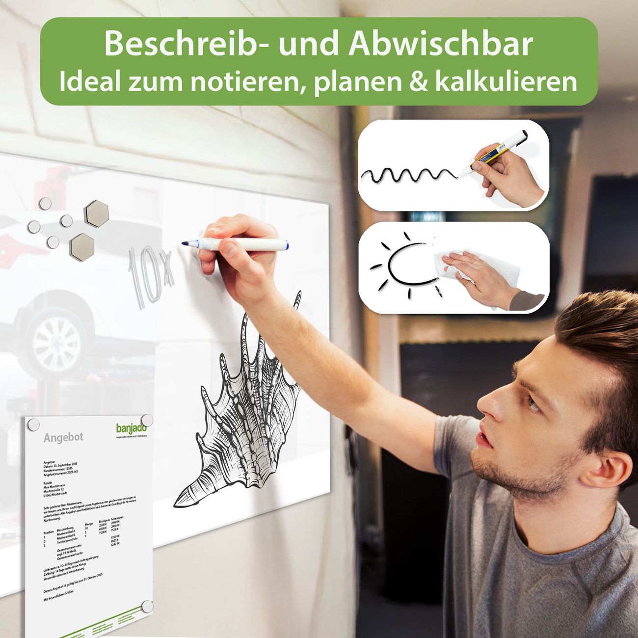Jede Glas Magnettafel wird in unserer Werkstatt von Hand gefertigt und sorgfältig geprüft. So erhalten Sie ein echtes Qualitätsprodukt, das Funktion und Ästhetik perfekt vereint.?? Warum banjado?