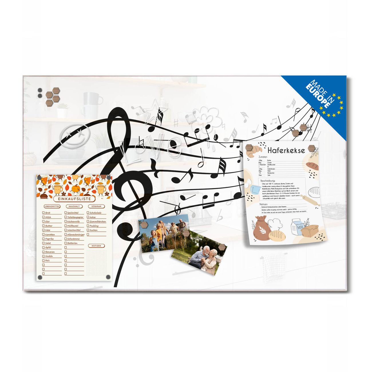 Ein Stück Design, das Ihren Alltag organisiert. Schreiben, heften, inspirieren - alles an einem Ort. Qualität, die man spürt. Montage leicht gemacht. Handwerk mit Herz - veredelt in Sachsen. Einzigartiges Design mit Motiv Motiv Musikalische Noten Beschreibbare Glasoberfläche, leicht zu reinigen Starke Magnetkraft durch Stahlrückwand Inklusive 4 Neodym-Magneten Flexible Montageoptionen Handveredelt in Sachsen - Qualität, die bleibt