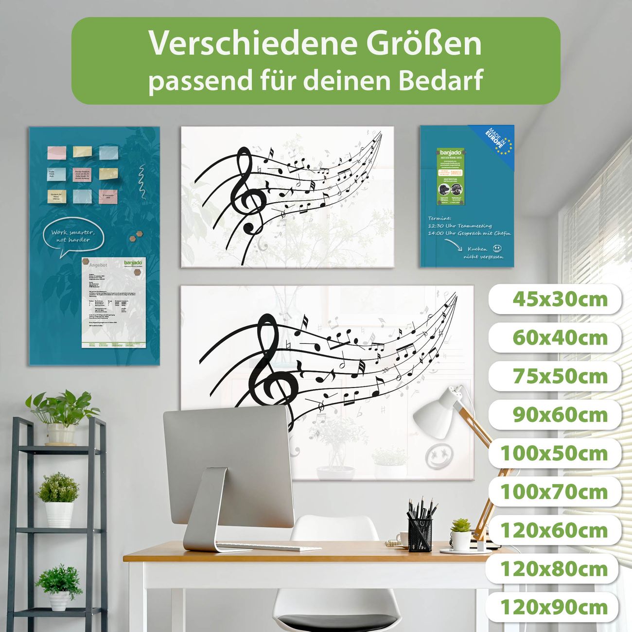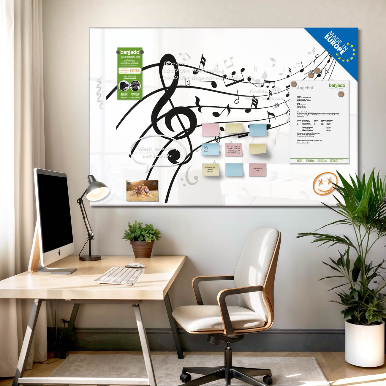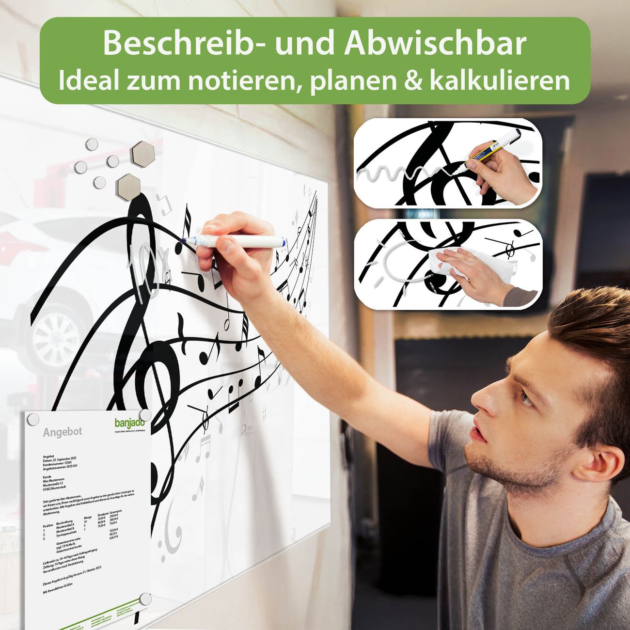 Jede Glas Magnettafel wird in unserer Werkstatt von Hand gefertigt und sorgfältig geprüft. So erhalten Sie ein echtes Qualitätsprodukt, das Funktion und Ästhetik perfekt vereint.?? Warum banjado?