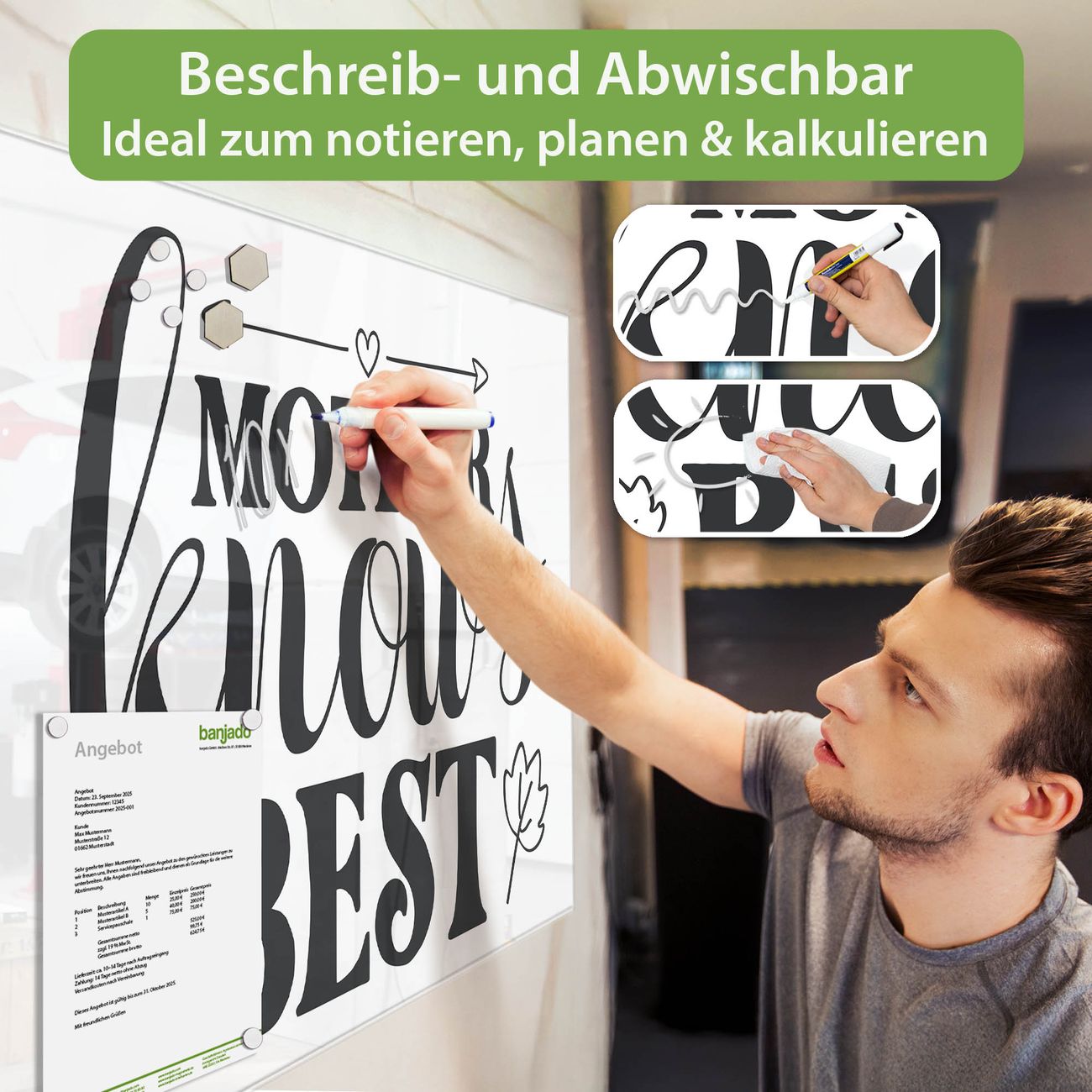 Jede Glas Magnettafel wird in unserer Werkstatt von Hand gefertigt und sorgfältig geprüft. So erhalten Sie ein echtes Qualitätsprodukt, das Funktion und Ästhetik perfekt vereint.?? Warum banjado?