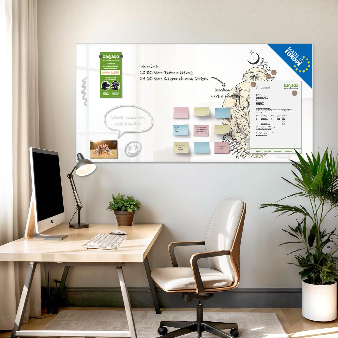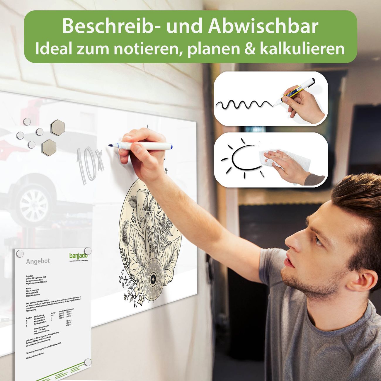Jede Glas Magnettafel wird in unserer Werkstatt von Hand gefertigt und sorgfältig geprüft. So erhalten Sie ein echtes Qualitätsprodukt, das Funktion und Ästhetik perfekt vereint.?? Warum banjado?