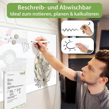 Auf der glatten Glasoberfläche lassen sich Termine, Rezepte oder Notizen ganz einfach mit Kreidestiften festhalten und rückstandslos entfernen. Starke Neodym-Magnete halten Ihre wichtigsten Erinnerungen sicher an Ort und Stelle. So entsteht Ihre ganz persönliche Ideenwand - jeden Tag neu.