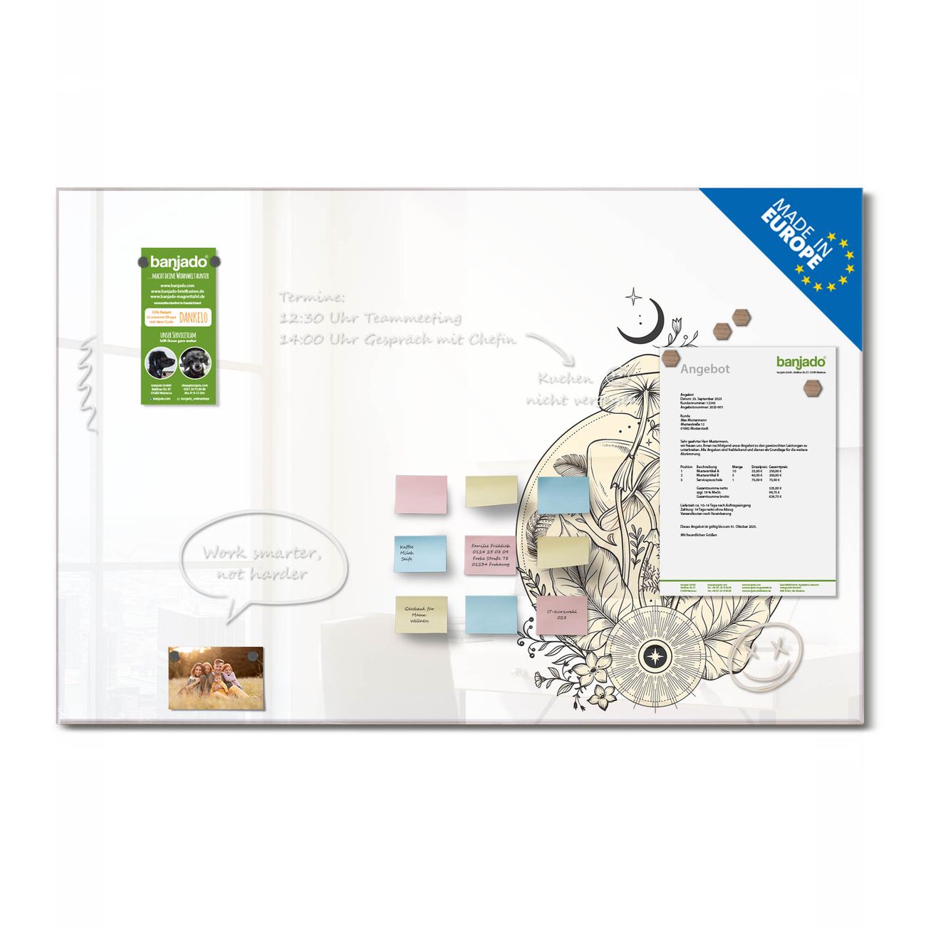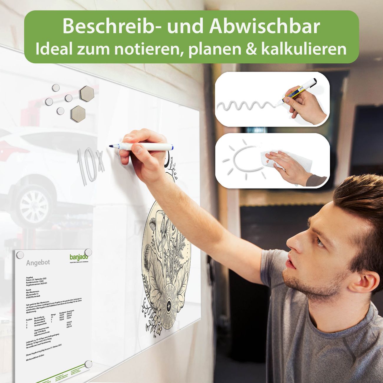 Jede Glas Magnettafel wird in unserer Werkstatt von Hand gefertigt und sorgfältig geprüft. So erhalten Sie ein echtes Qualitätsprodukt, das Funktion und Ästhetik perfekt vereint.?? Warum banjado?