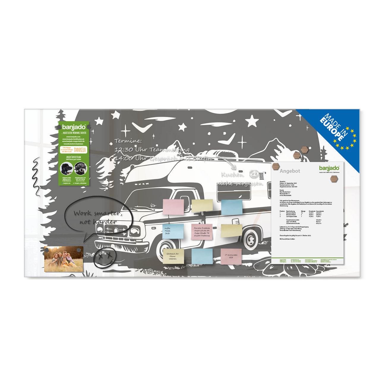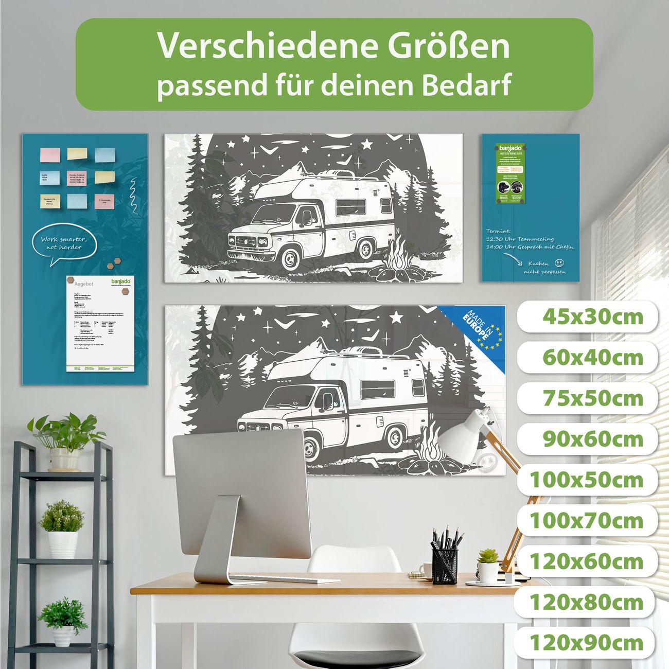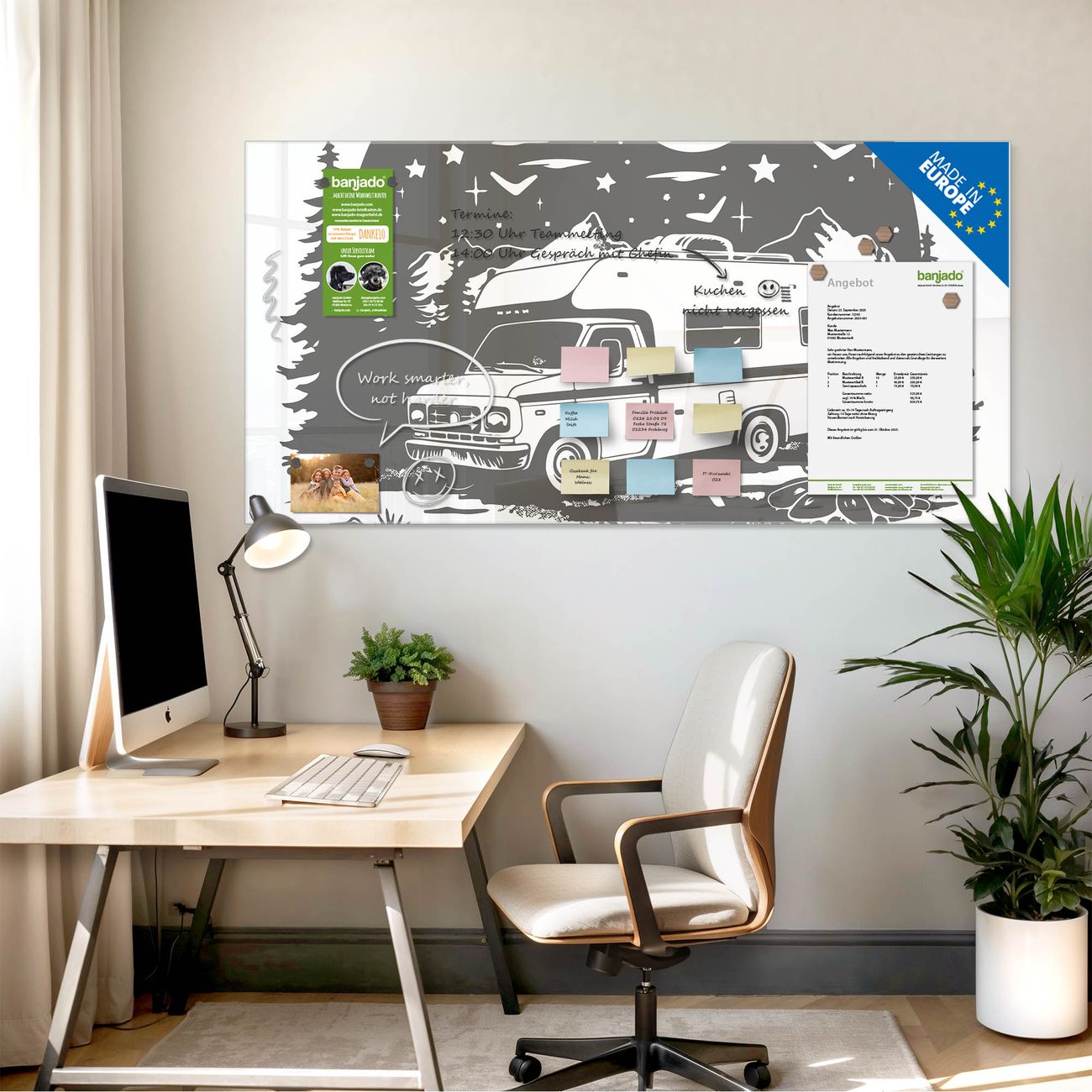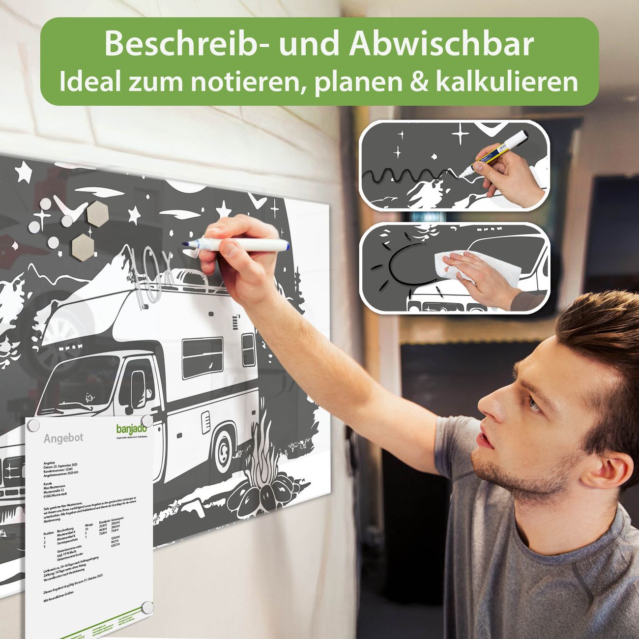 Jede Glas Magnettafel wird in unserer Werkstatt von Hand gefertigt und sorgfältig geprüft. So erhalten Sie ein echtes Qualitätsprodukt, das Funktion und Ästhetik perfekt vereint.?? Warum banjado?