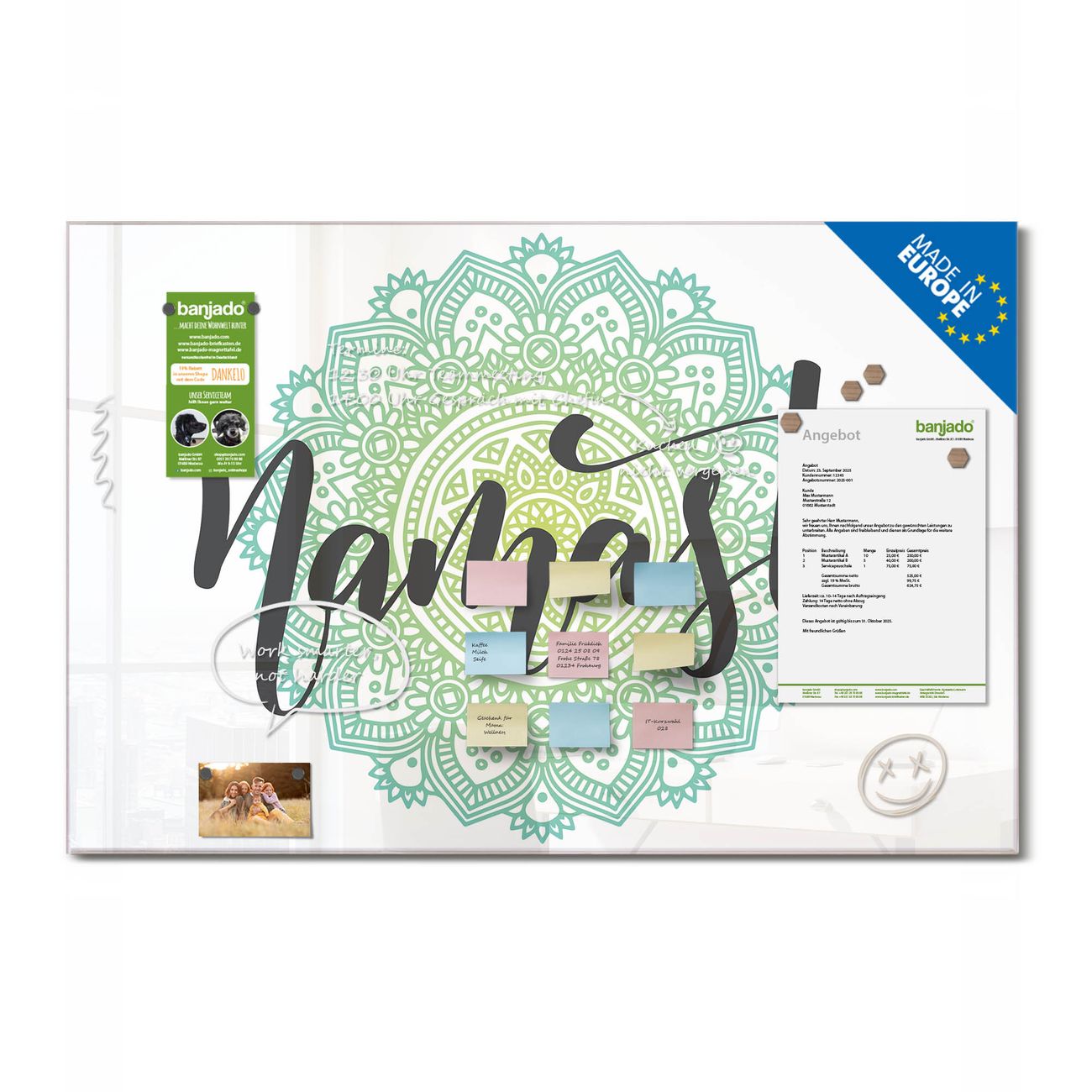 Die banjado Glas Magnettafel mit dem Motiv Motiv Namaste Mandala verbindet Funktionalität mit Stil. Sie ersetzt das Zettelchaos durch klare Strukturen und bringt dabei eine warme, natürliche Atmosphäre in Ihr Zuhause. Ob im Büro, in der Küche oder im Eingangsbereich - dieses Design-Board zieht Blicke an und sorgt für Ordnung mit Charakter.