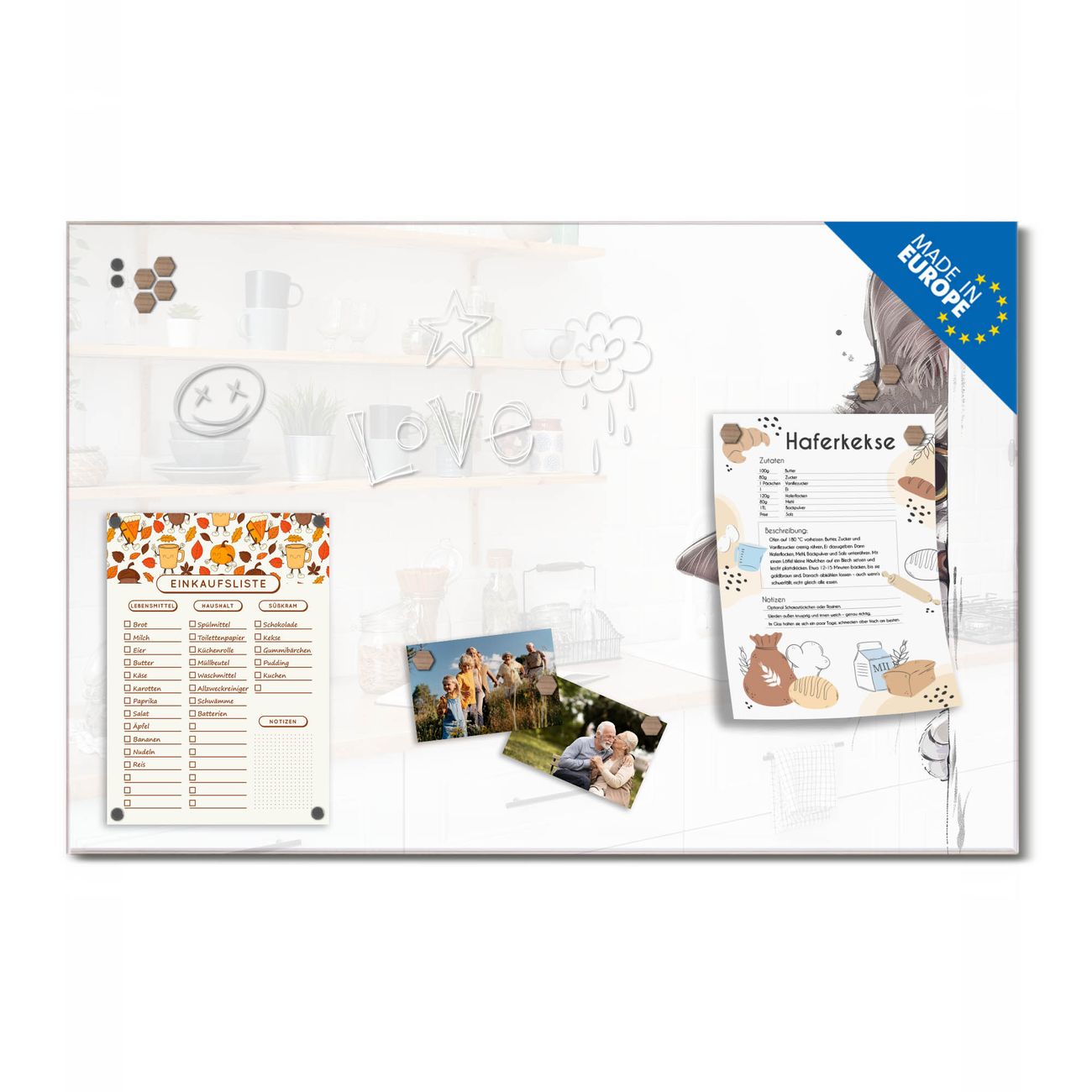 Auf der glatten Glasoberfläche lassen sich Termine, Rezepte oder Notizen ganz einfach mit Kreidestiften festhalten und rückstandslos entfernen. Starke Neodym-Magnete halten Ihre wichtigsten Erinnerungen sicher an Ort und Stelle. So entsteht Ihre ganz persönliche Ideenwand - jeden Tag neu.