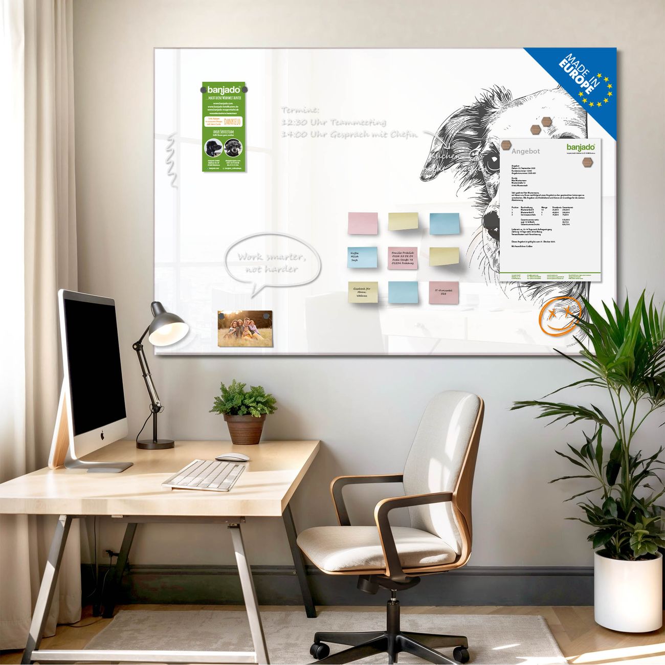 Jede Glas Magnettafel wird in unserer Werkstatt von Hand gefertigt und sorgfältig geprüft. So erhalten Sie ein echtes Qualitätsprodukt, das Funktion und Ästhetik perfekt vereint.?? Warum banjado?