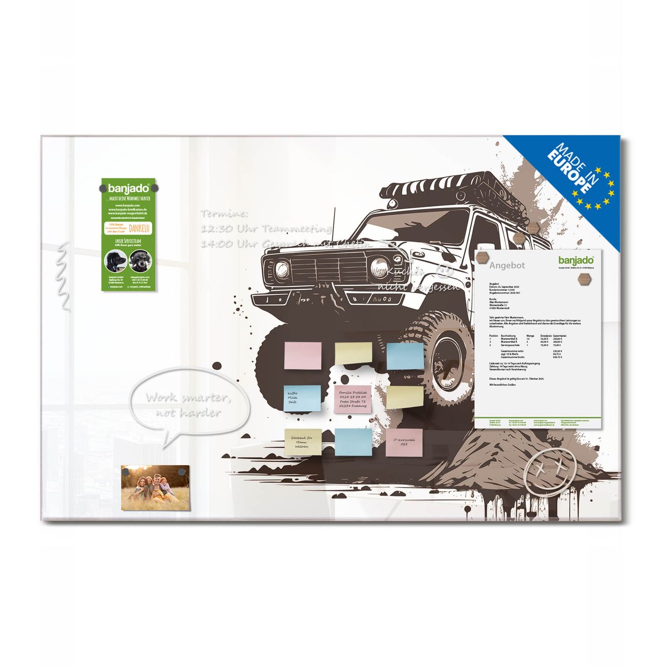 Die banjado Glas Magnettafel mit dem Motiv Motiv Offroad Abenteuer 3 verbindet Funktionalität mit Stil. Sie ersetzt das Zettelchaos durch klare Strukturen und bringt dabei eine warme, natürliche Atmosphäre in Ihr Zuhause. Ob im Büro, in der Küche oder im Eingangsbereich - dieses Design-Board zieht Blicke an und sorgt für Ordnung mit Charakter.