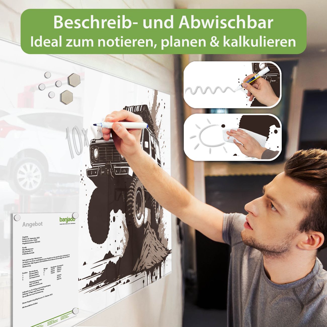 Jede Glas Magnettafel wird in unserer Werkstatt von Hand gefertigt und sorgfältig geprüft. So erhalten Sie ein echtes Qualitätsprodukt, das Funktion und Ästhetik perfekt vereint.?? Warum banjado?