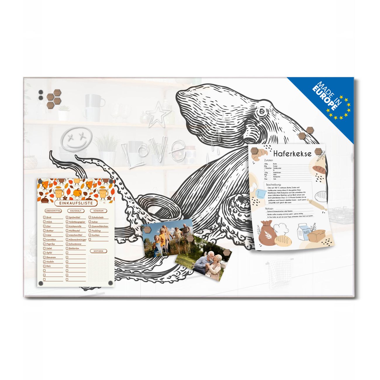 Ein Stück Design, das Ihren Alltag organisiert. Schreiben, heften, inspirieren - alles an einem Ort. Qualität, die man spürt. Montage leicht gemacht. Handwerk mit Herz - veredelt in Sachsen. Einzigartiges Design mit Motiv Motiv Oktopus 6 Beschreibbare Glasoberfläche, leicht zu reinigen Starke Magnetkraft durch Stahlrückwand Inklusive 4 Neodym-Magneten Flexible Montageoptionen Handveredelt in Sachsen - Qualität, die bleibt
