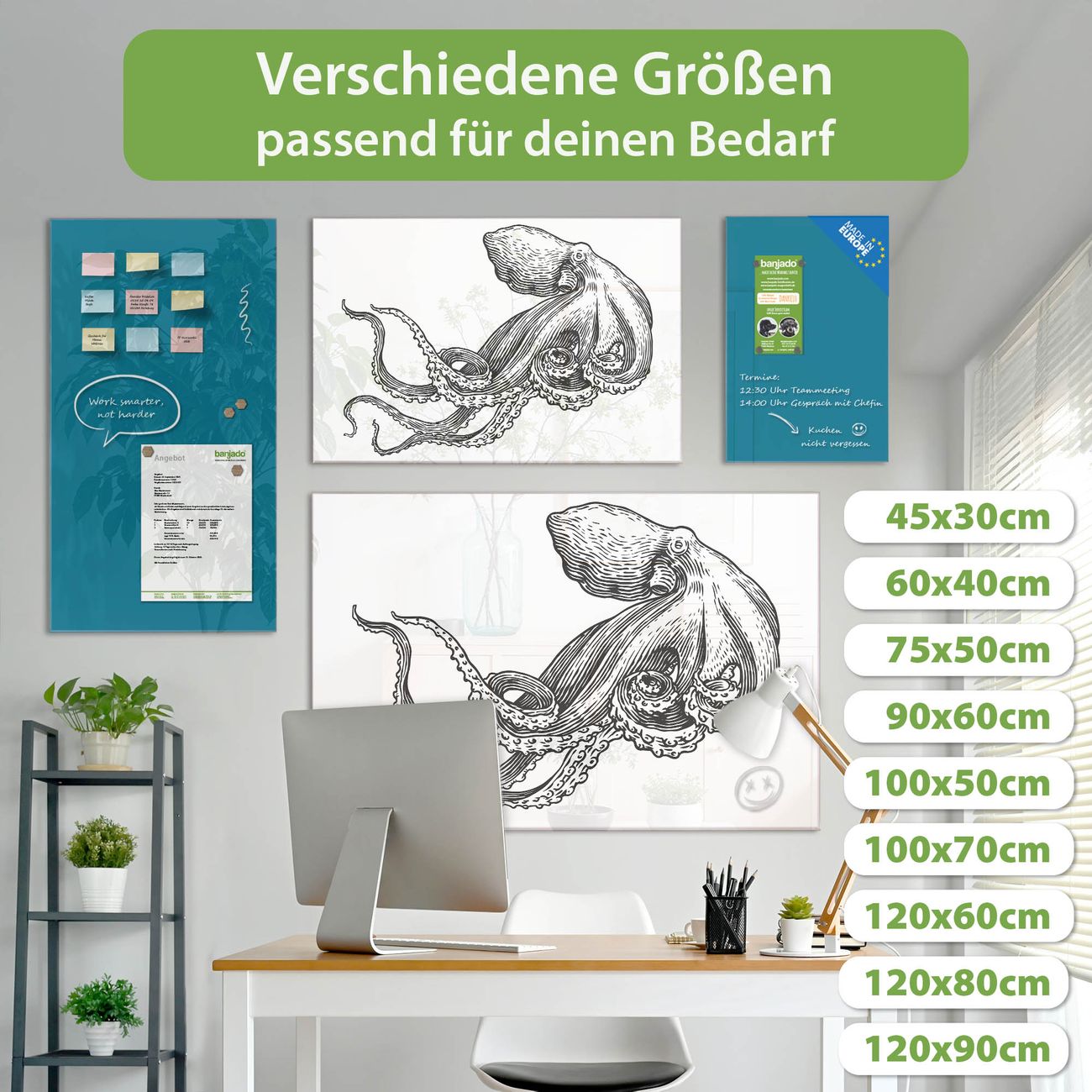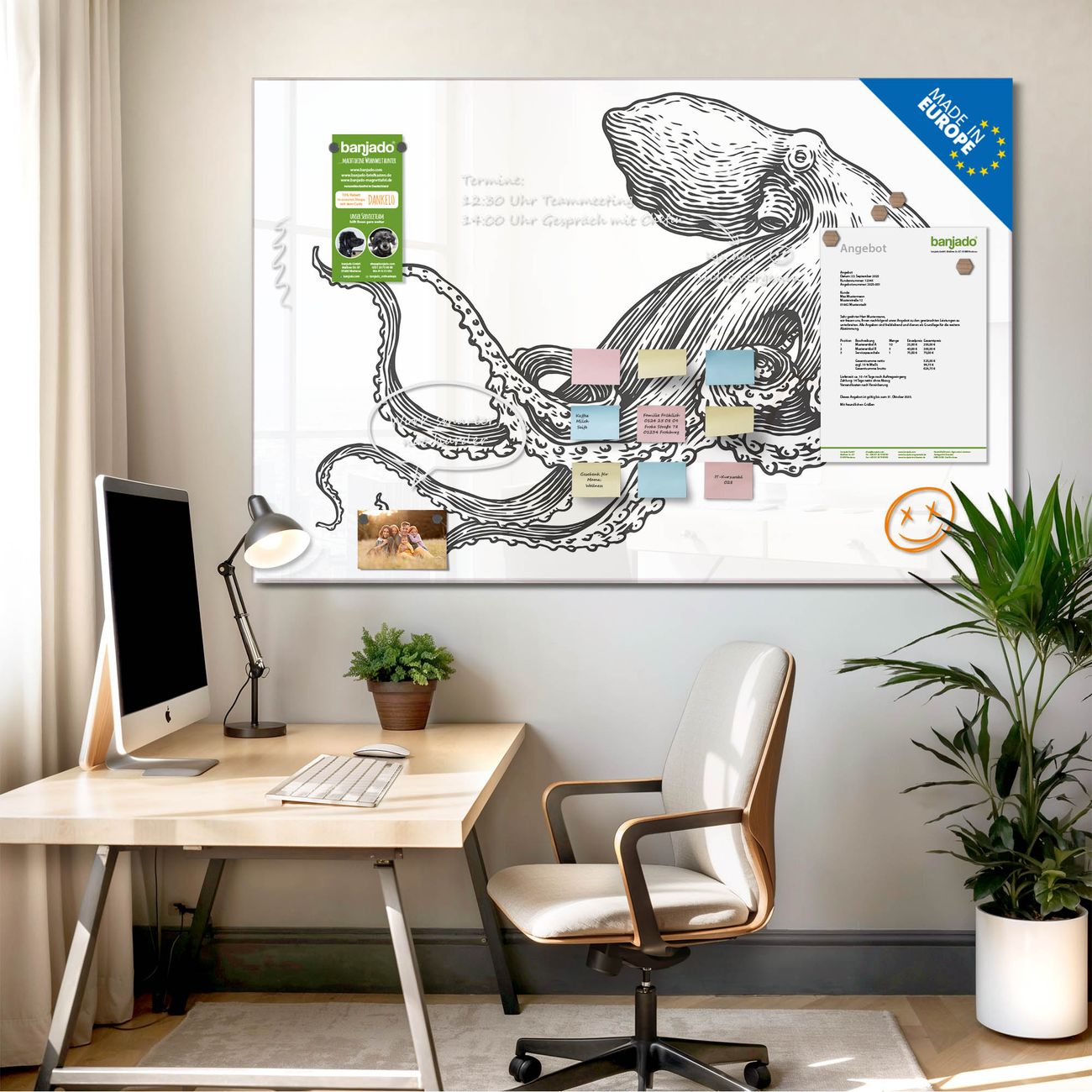 Die banjado Glas Magnettafel mit dem Motiv Motiv Oktopus 6 verbindet Funktionalität mit Stil. Sie ersetzt das Zettelchaos durch klare Strukturen und bringt dabei eine warme, natürliche Atmosphäre in Ihr Zuhause. Ob im Büro, in der Küche oder im Eingangsbereich - dieses Design-Board zieht Blicke an und sorgt für Ordnung mit Charakter.