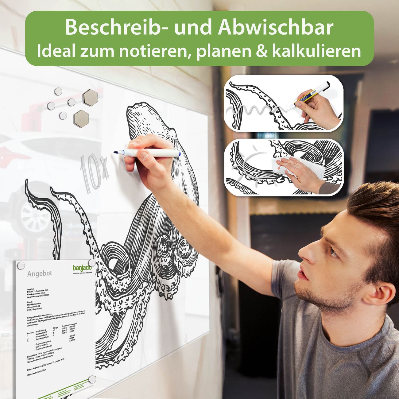 Jede Glas Magnettafel wird in unserer Werkstatt von Hand gefertigt und sorgfältig geprüft. So erhalten Sie ein echtes Qualitätsprodukt, das Funktion und Ästhetik perfekt vereint.?? Warum banjado?