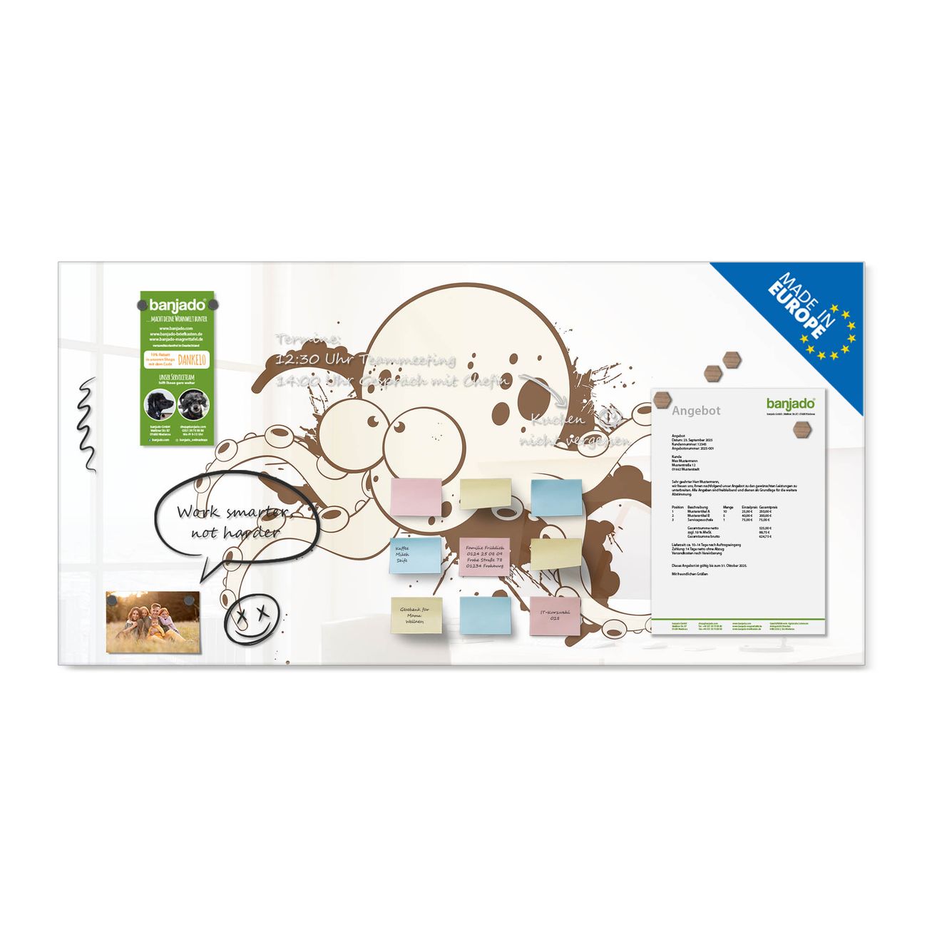 Ein Stück Design, das Ihren Alltag organisiert. Schreiben, heften, inspirieren - alles an einem Ort. Qualität, die man spürt. Montage leicht gemacht. Handwerk mit Herz - veredelt in Sachsen. Einzigartiges Design mit Motiv Motiv Oktopus Comic 2 Beschreibbare Glasoberfläche, leicht zu reinigen Starke Magnetkraft durch Stahlrückwand Inklusive 4 Neodym-Magneten Flexible Montageoptionen Handveredelt in Sachsen - Qualität, die bleibt