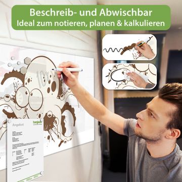 Auf der glatten Glasoberfläche lassen sich Termine, Rezepte oder Notizen ganz einfach mit Kreidestiften festhalten und rückstandslos entfernen. Starke Neodym-Magnete halten Ihre wichtigsten Erinnerungen sicher an Ort und Stelle. So entsteht Ihre ganz persönliche Ideenwand - jeden Tag neu.