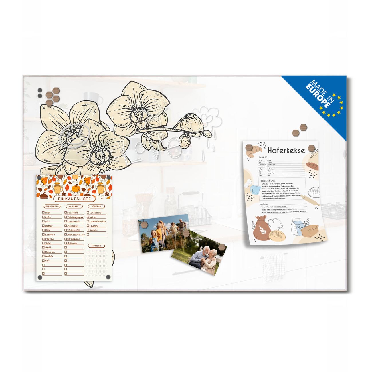 Ein Stück Design, das Ihren Alltag organisiert. Schreiben, heften, inspirieren - alles an einem Ort. Qualität, die man spürt. Montage leicht gemacht. Handwerk mit Herz - veredelt in Sachsen. Einzigartiges Design mit Motiv Motiv Orchideenzeichnung Beschreibbare Glasoberfläche, leicht zu reinigen Starke Magnetkraft durch Stahlrückwand Inklusive 4 Neodym-Magneten Flexible Montageoptionen Handveredelt in Sachsen - Qualität, die bleibt