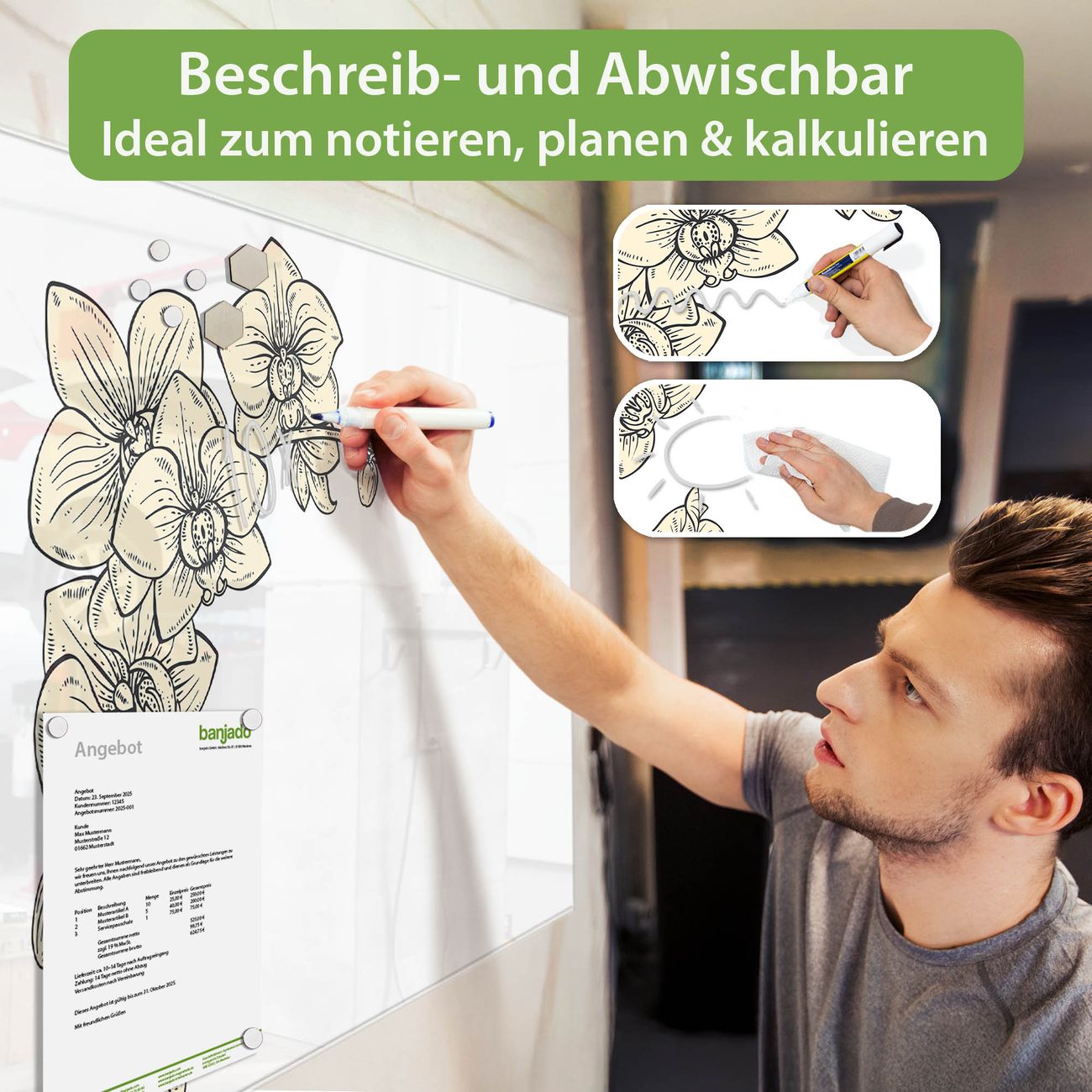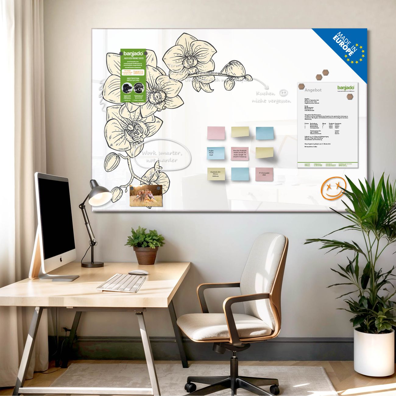 Jede Glas Magnettafel wird in unserer Werkstatt von Hand gefertigt und sorgfältig geprüft. So erhalten Sie ein echtes Qualitätsprodukt, das Funktion und Ästhetik perfekt vereint.?? Warum banjado?