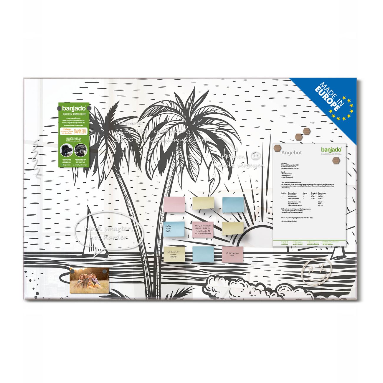 Jede Glas Magnettafel wird in unserer Werkstatt von Hand gefertigt und sorgfältig geprüft. So erhalten Sie ein echtes Qualitätsprodukt, das Funktion und Ästhetik perfekt vereint.?? Warum banjado?