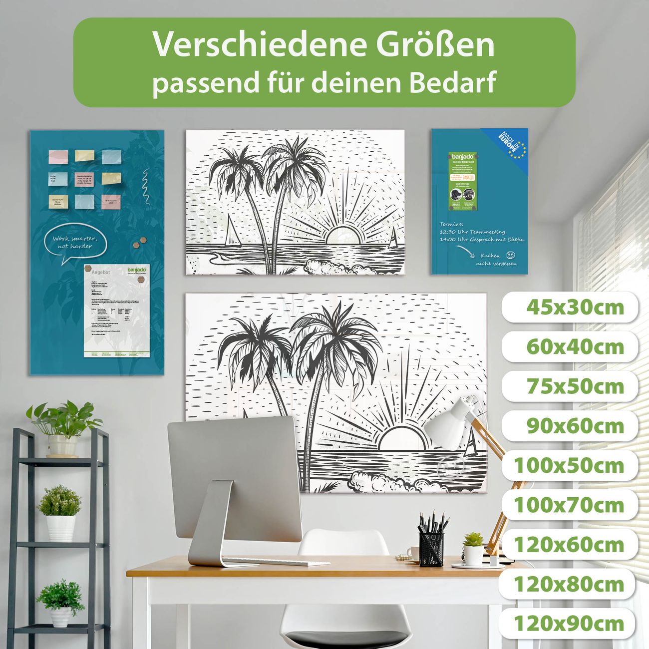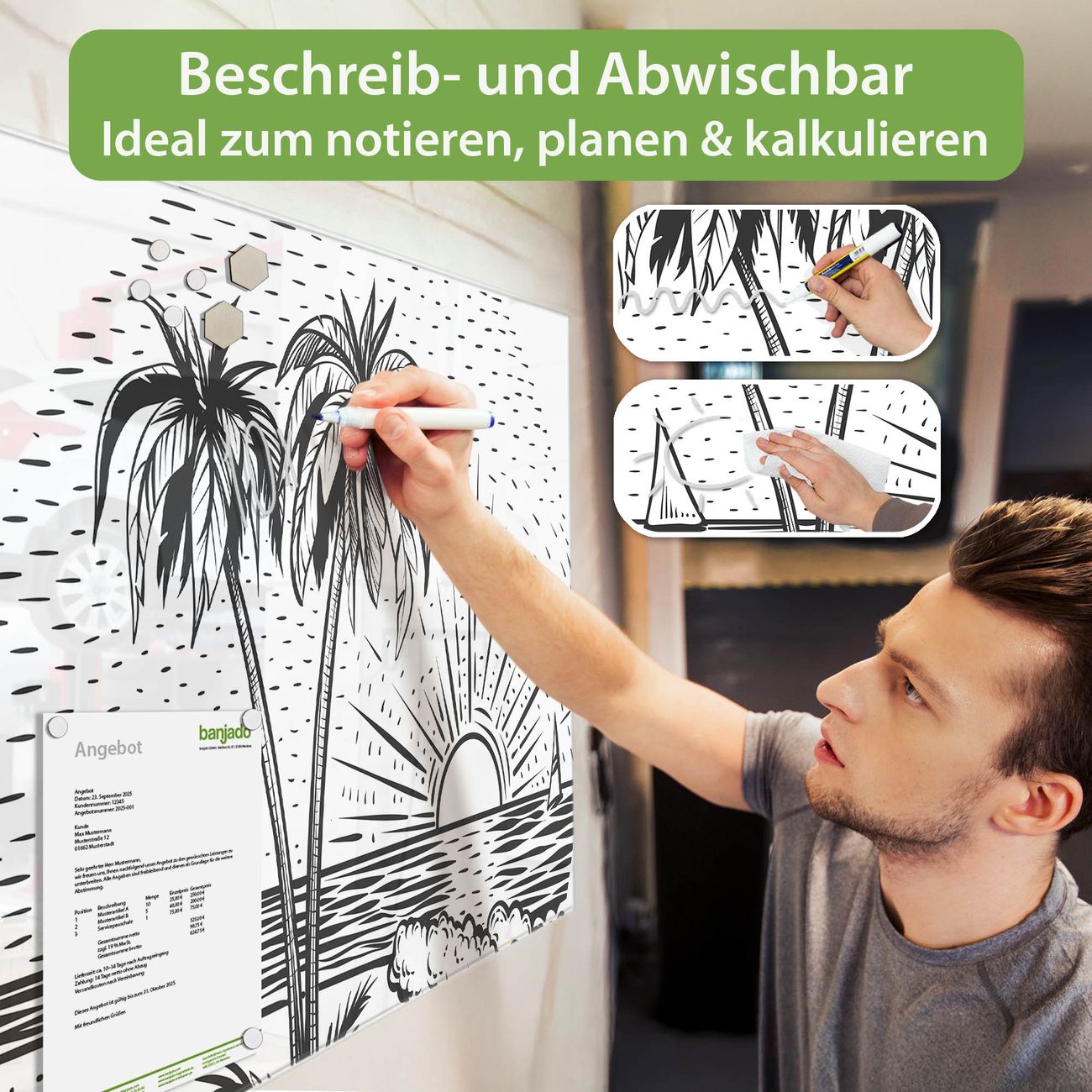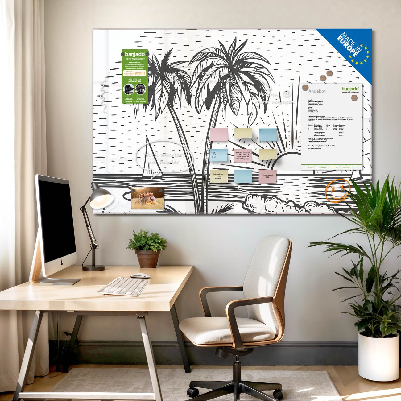 Jede Glas Magnettafel wird in unserer Werkstatt von Hand gefertigt und sorgfältig geprüft. So erhalten Sie ein echtes Qualitätsprodukt, das Funktion und Ästhetik perfekt vereint.?? Warum banjado?