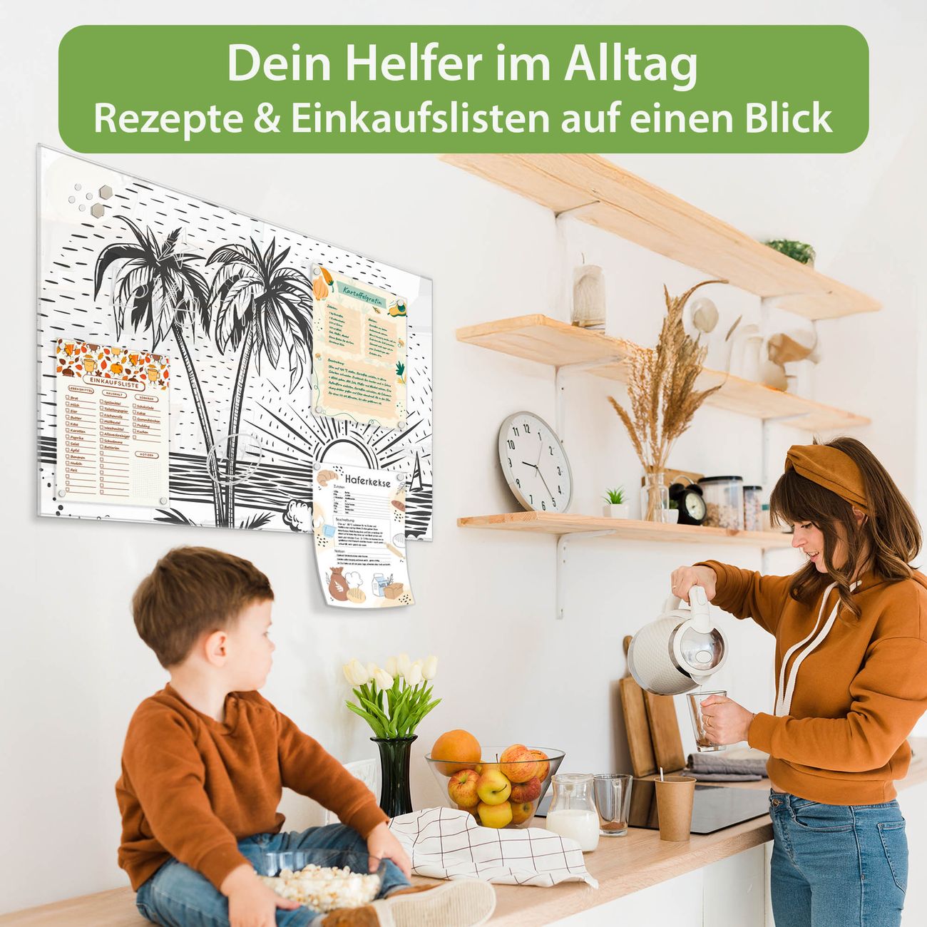 Auf der glatten Glasoberfläche lassen sich Termine, Rezepte oder Notizen ganz einfach mit Kreidestiften festhalten und rückstandslos entfernen. Starke Neodym-Magnete halten Ihre wichtigsten Erinnerungen sicher an Ort und Stelle. So entsteht Ihre ganz persönliche Ideenwand - jeden Tag neu.