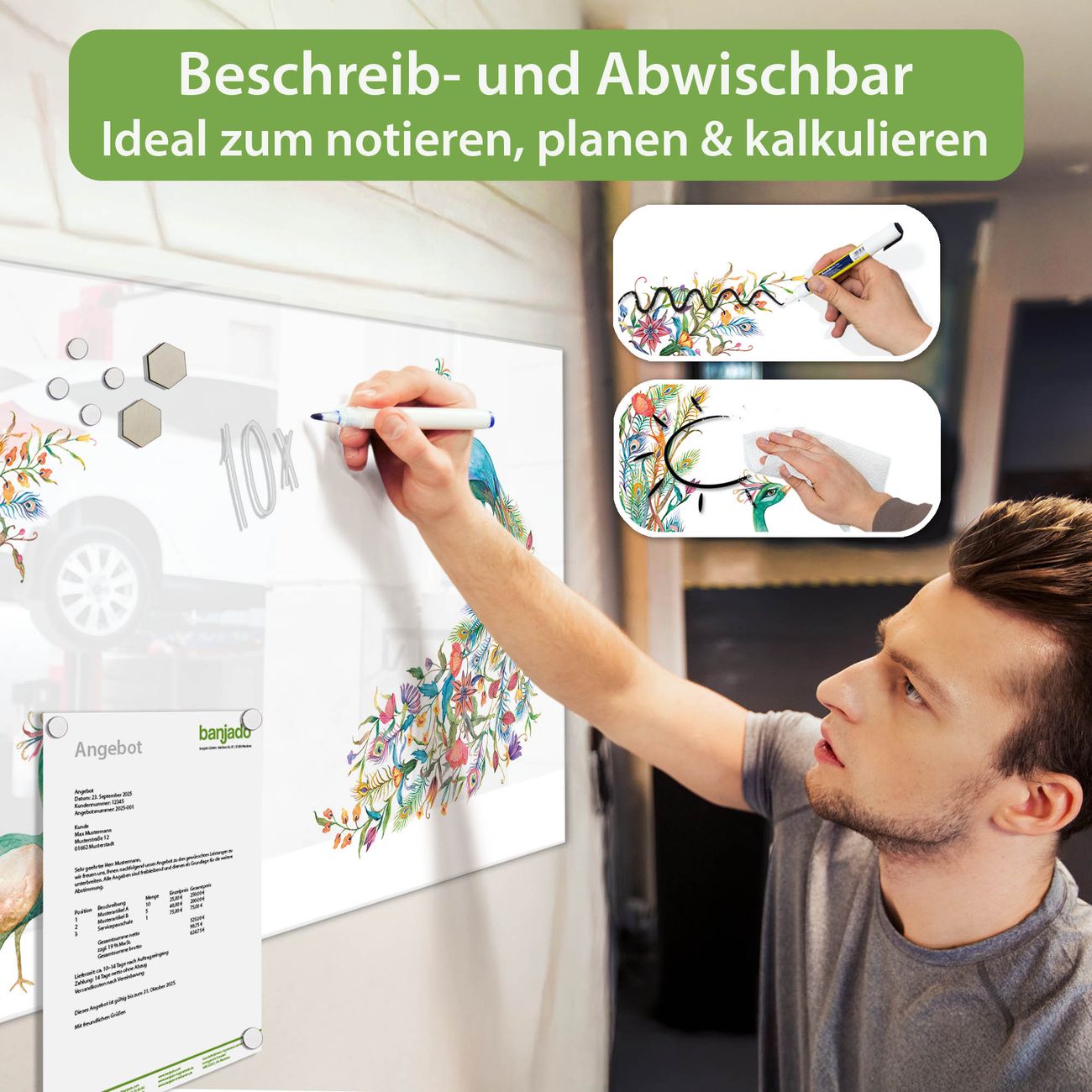 Die banjado Glas Magnettafel mit dem Motiv Motiv Pfauenparadies verbindet Funktionalität mit Stil. Sie ersetzt das Zettelchaos durch klare Strukturen und bringt dabei eine warme, natürliche Atmosphäre in Ihr Zuhause. Ob im Büro, in der Küche oder im Eingangsbereich - dieses Design-Board zieht Blicke an und sorgt für Ordnung mit Charakter.