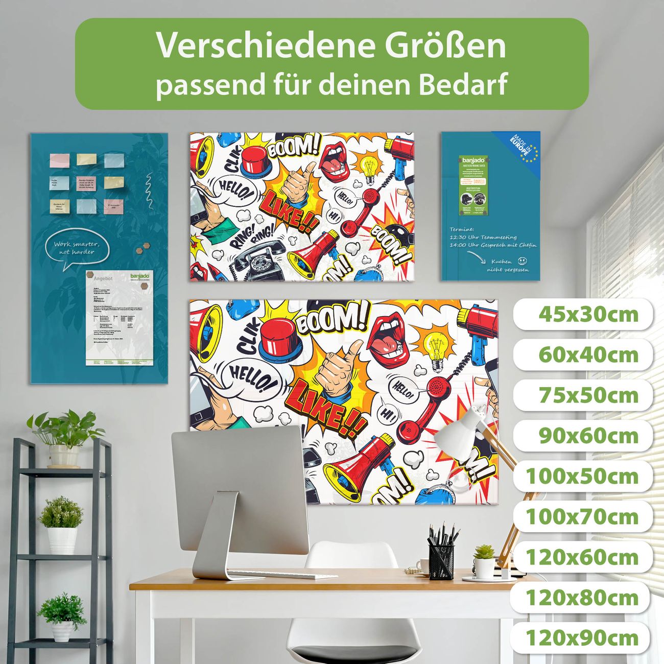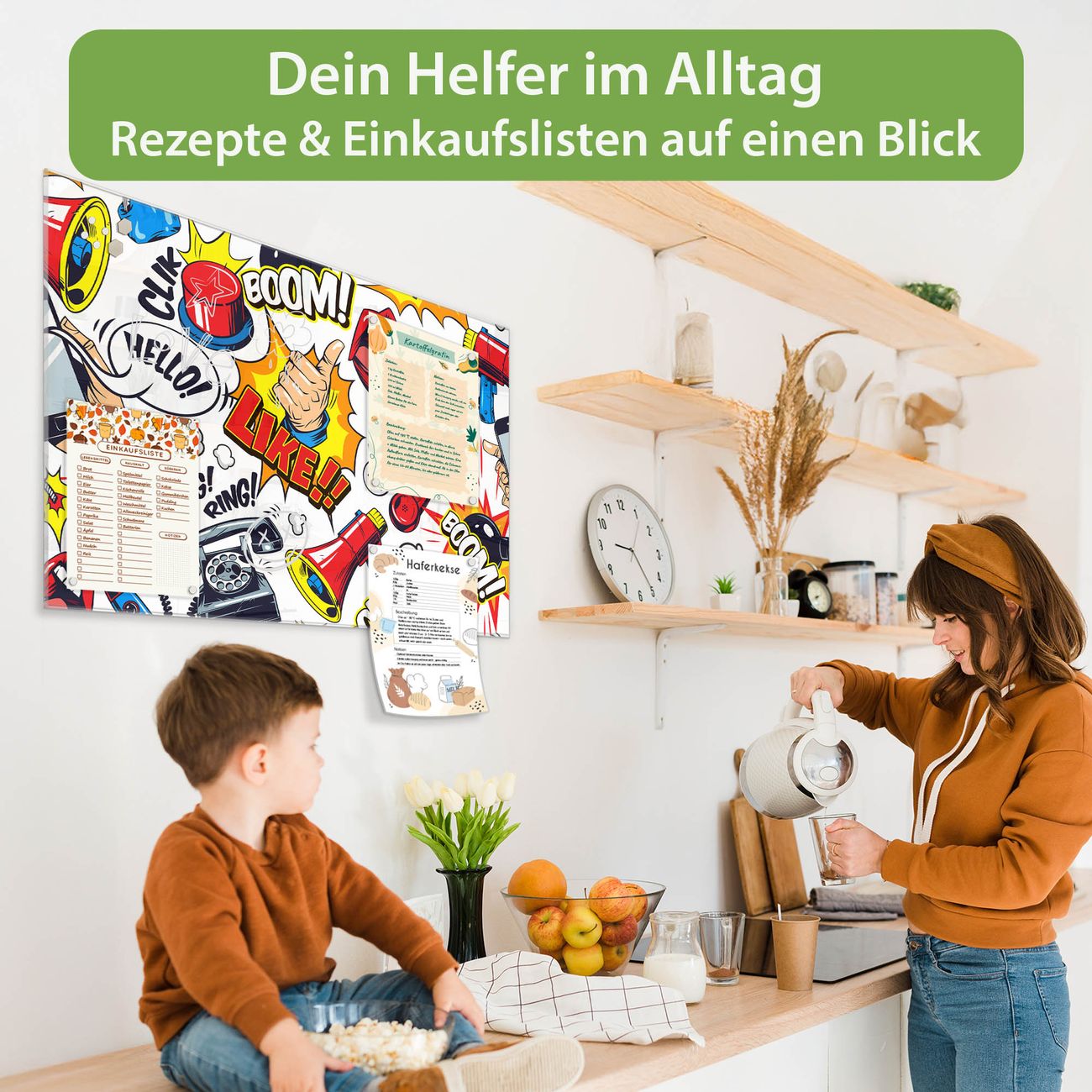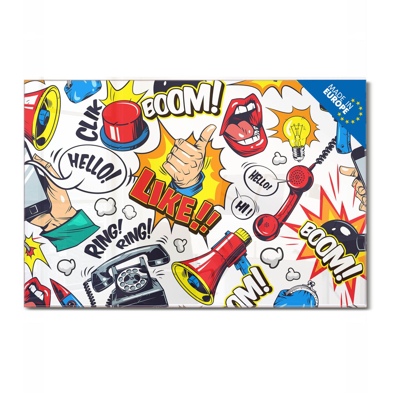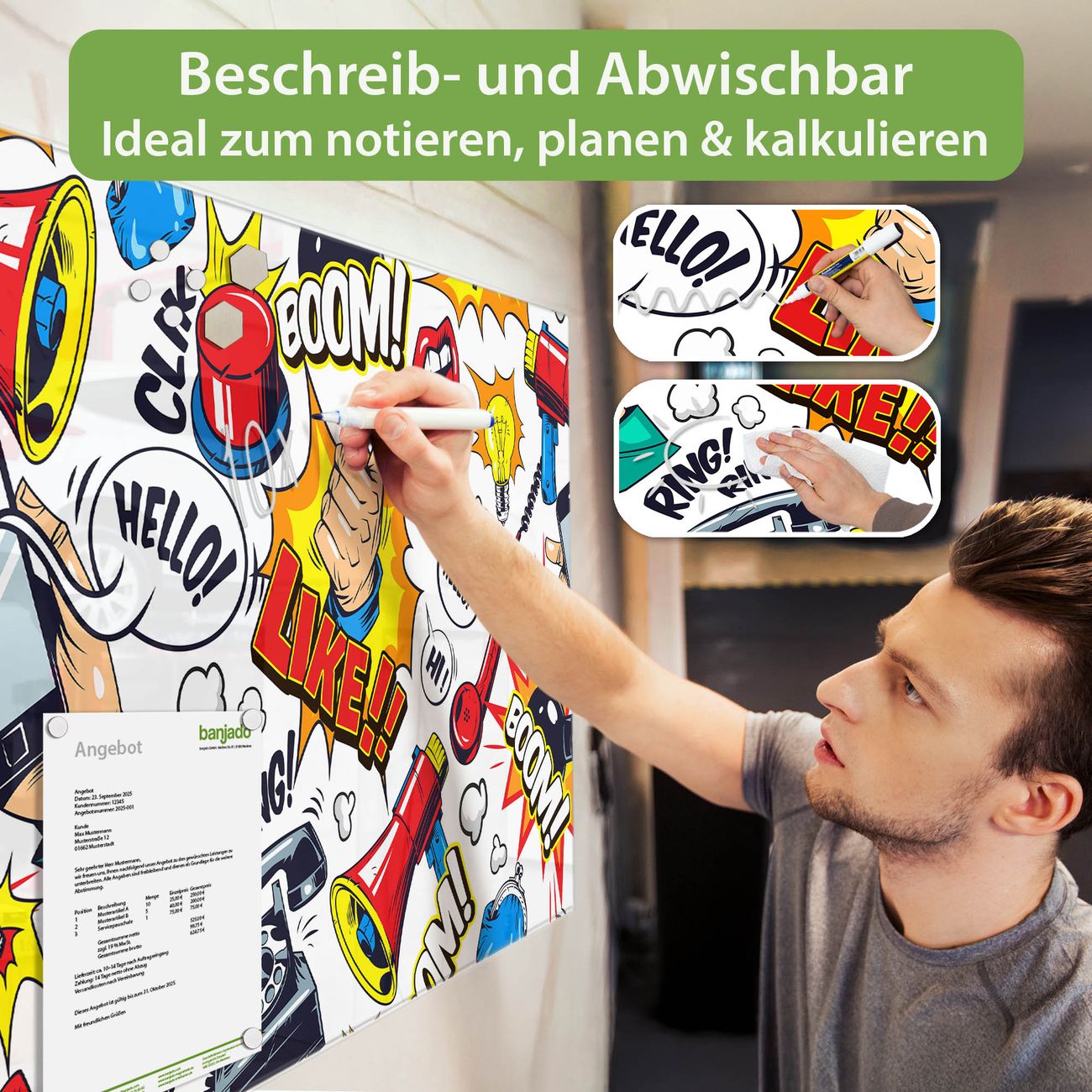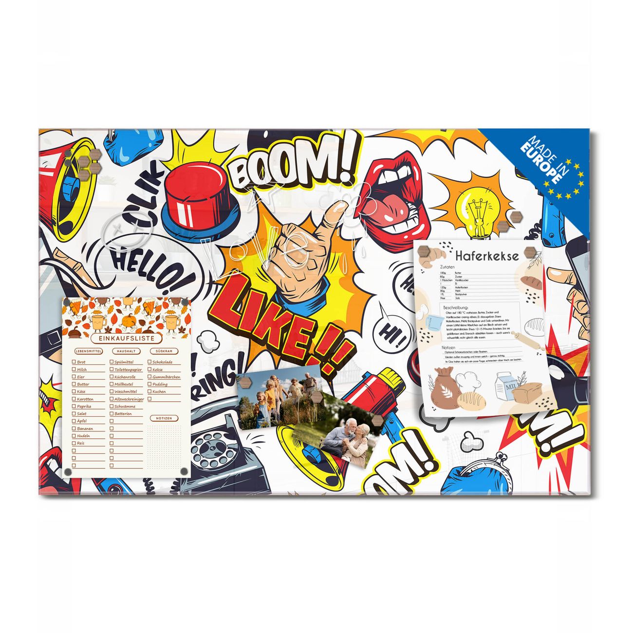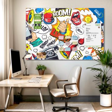 Ein Stück Design, das Ihren Alltag organisiert. Schreiben, heften, inspirieren - alles an einem Ort. Qualität, die man spürt. Montage leicht gemacht. Handwerk mit Herz - veredelt in Sachsen. Einzigartiges Design mit Motiv Motiv Pop-Art Comic Muster Beschreibbare Glasoberfläche, leicht zu reinigen Starke Magnetkraft durch Stahlrückwand Inklusive 4 Neodym-Magneten Flexible Montageoptionen Handveredelt in Sachsen - Qualität, die bleibt