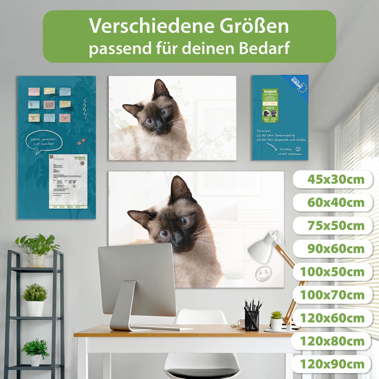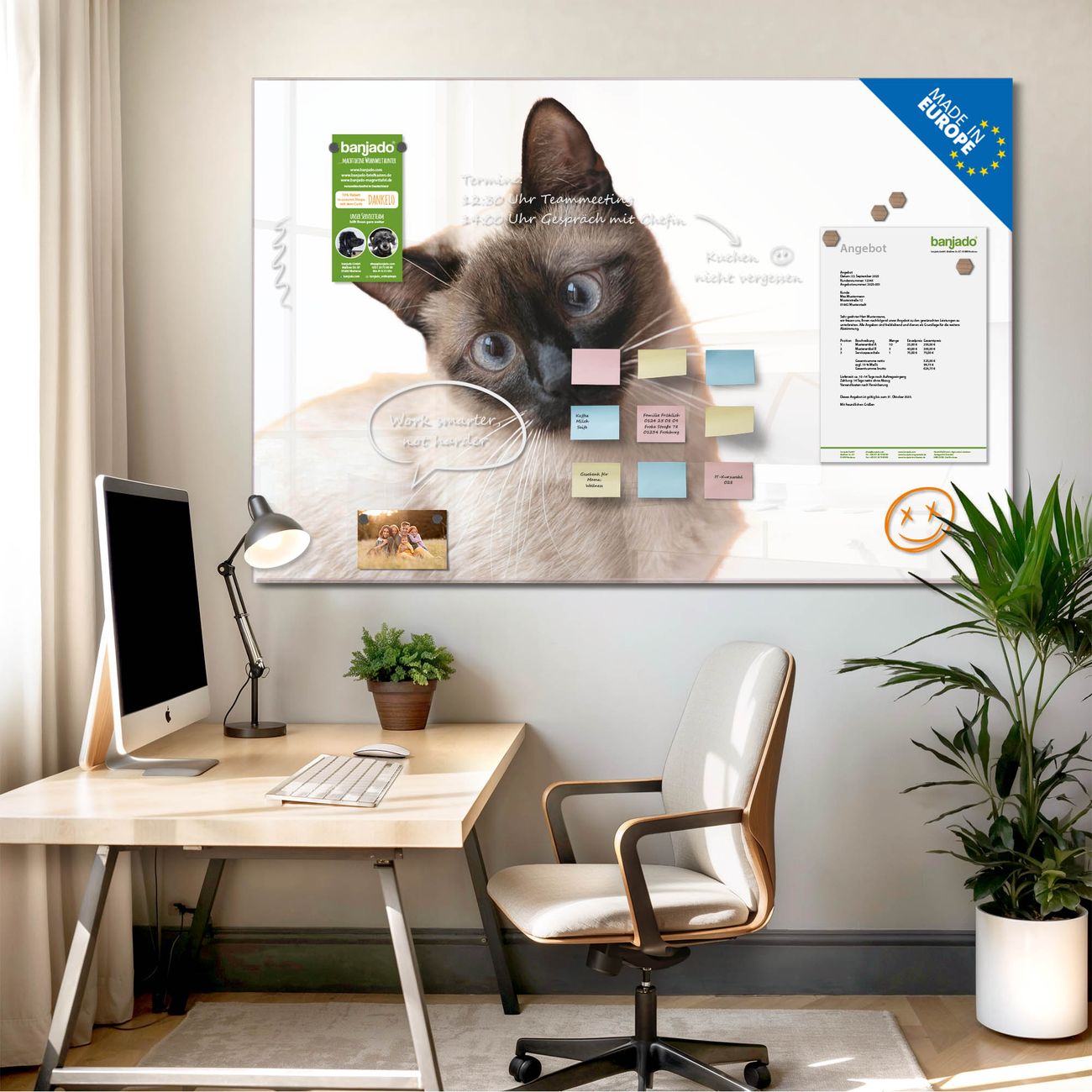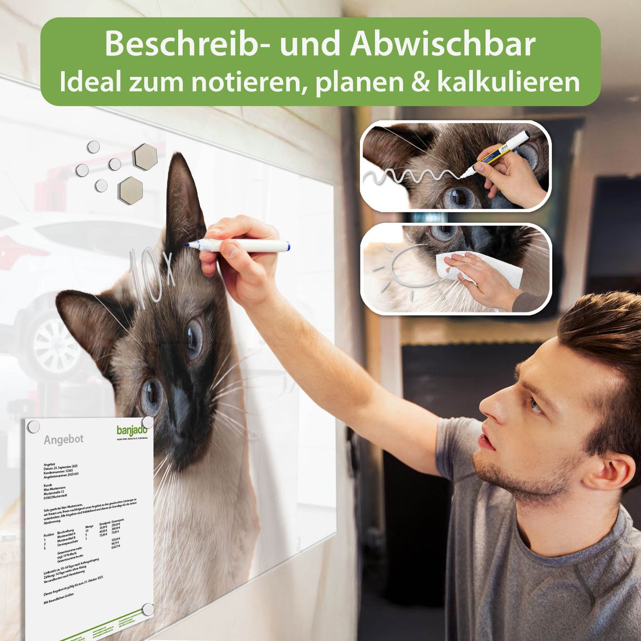 Jede Glas Magnettafel wird in unserer Werkstatt von Hand gefertigt und sorgfältig geprüft. So erhalten Sie ein echtes Qualitätsprodukt, das Funktion und Ästhetik perfekt vereint.?? Warum banjado?