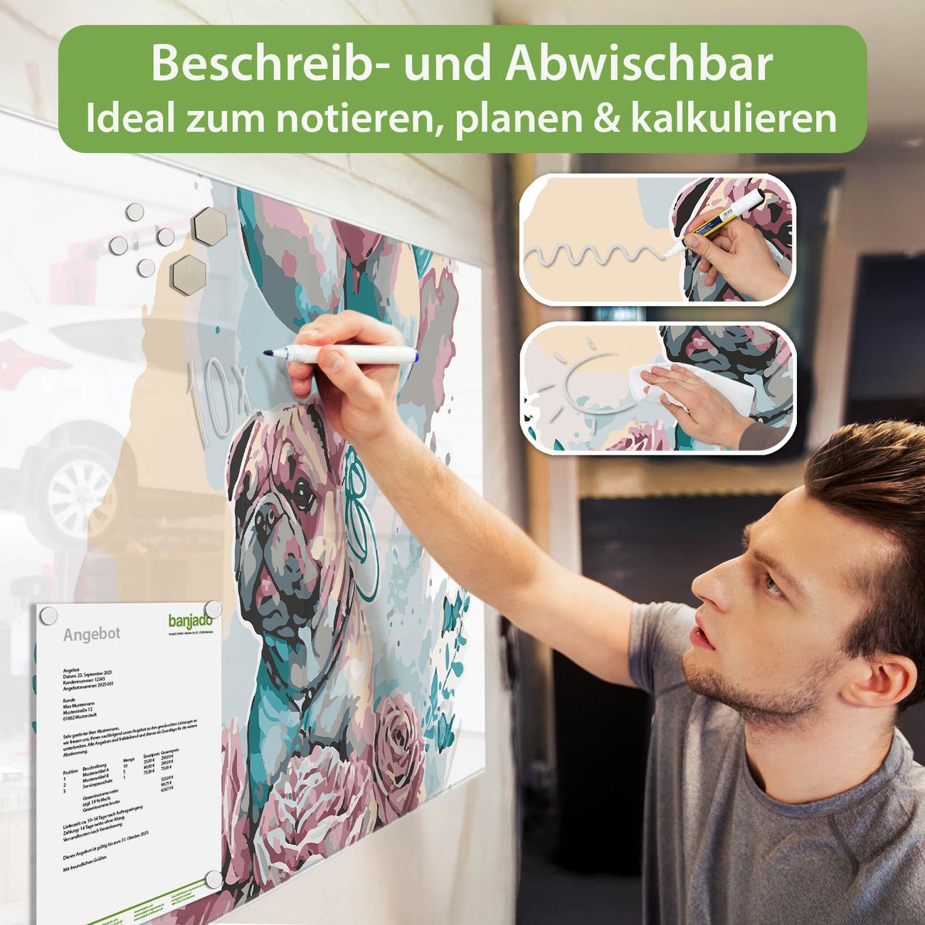 Jede Glas Magnettafel wird in unserer Werkstatt von Hand gefertigt und sorgfältig geprüft. So erhalten Sie ein echtes Qualitätsprodukt, das Funktion und Ästhetik perfekt vereint.?? Warum banjado?